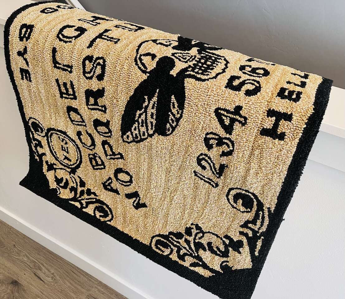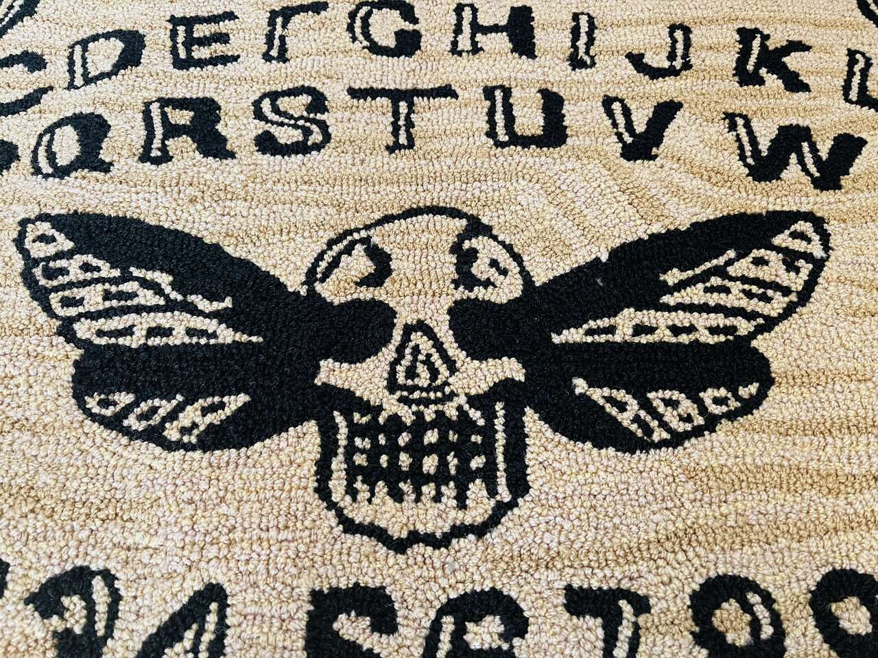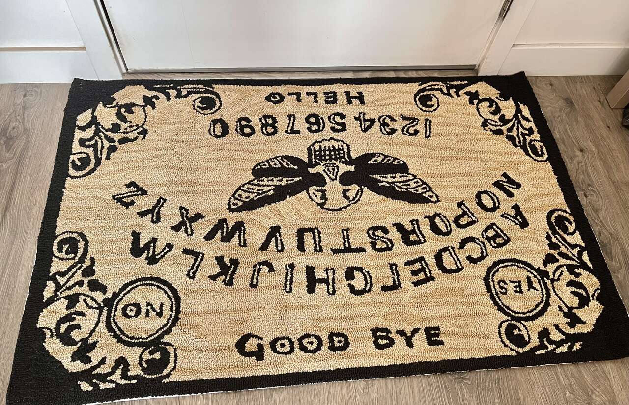 Rare, discontinued Grandin Road Spirit Board hand hooked indoor/outdoor door mat. Inspired by a Ouija board with a butterfly/moth skull at the center with the words Hello greeting you as you enter and the words Goodbye as your guests leave. Two tone tan wood grain detailing and black in color. Durable and washable. Large 30" x 48" size. Very nice quality and design! Super fun and unique for Halloween decorating. Originally retailed for $129.