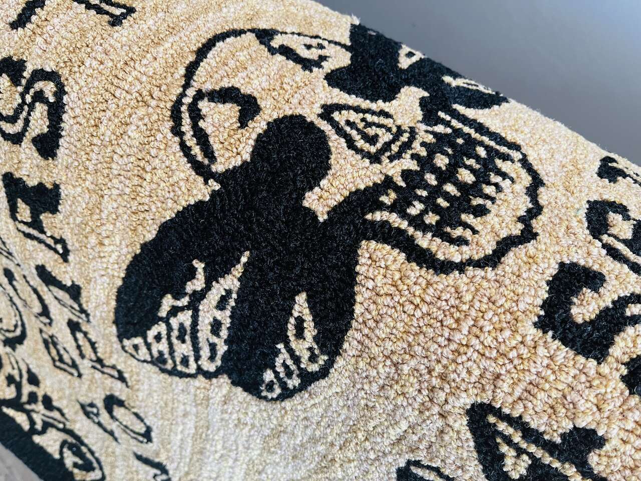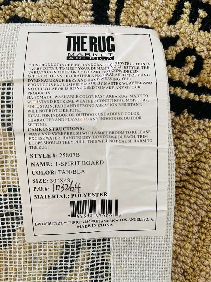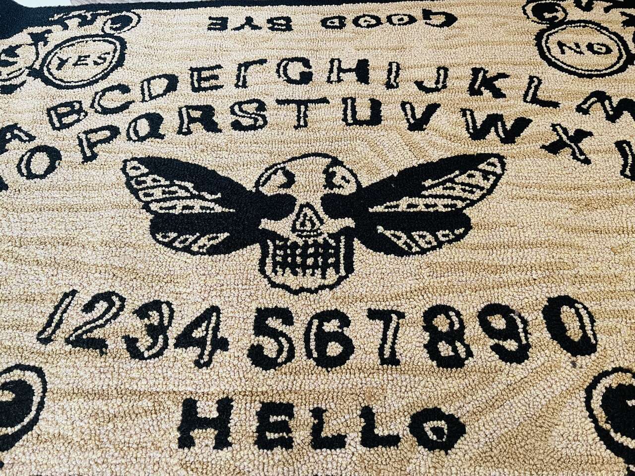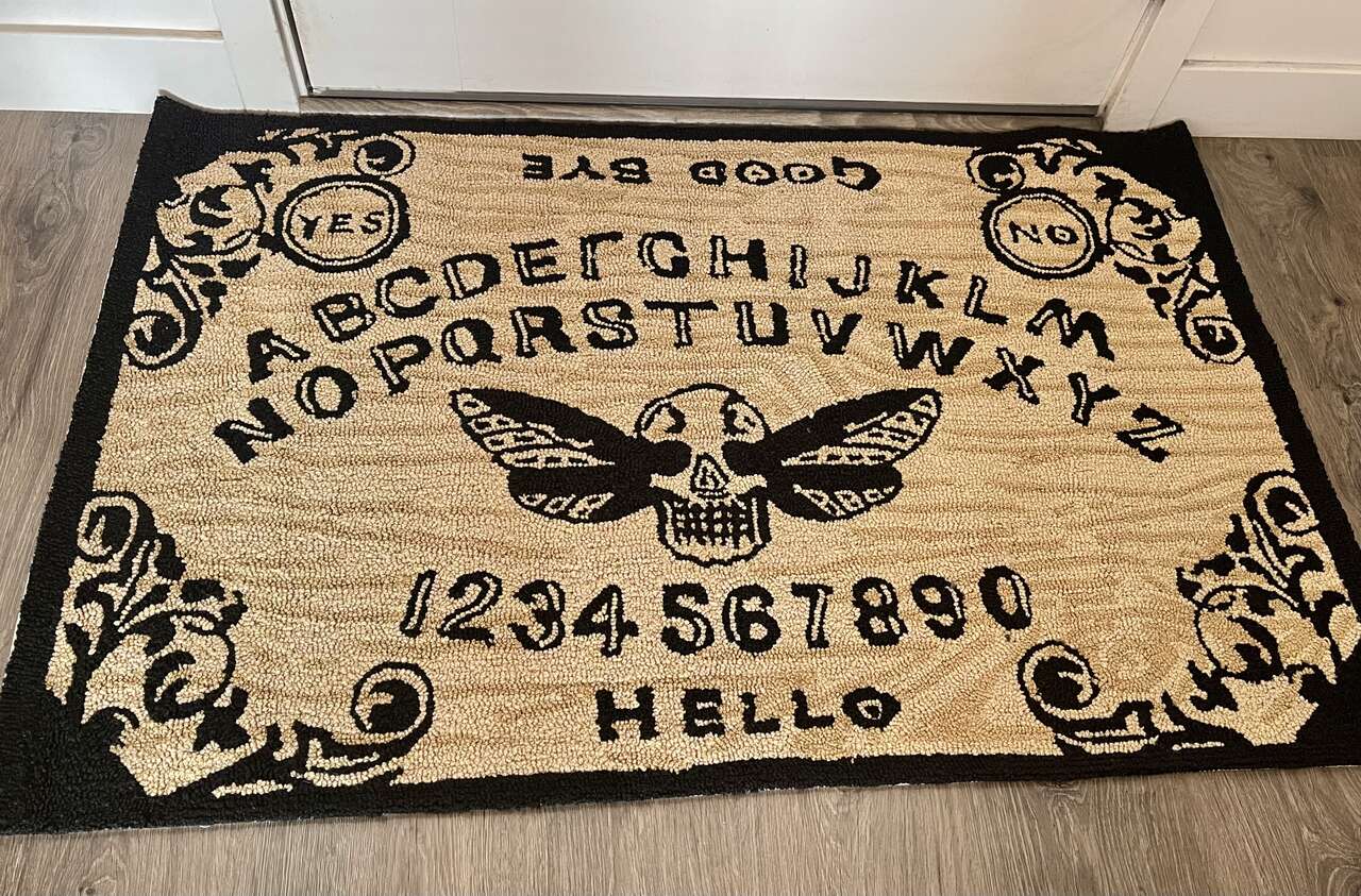 Rare, discontinued Grandin Road Spirit Board hand hooked indoor/outdoor door mat. Inspired by a Ouija board with a butterfly/moth skull at the center with the words Hello greeting you as you enter and the words Goodbye as your guests leave. Two tone tan wood grain detailing and black in color. Durable and washable. Large 30" x 48" size. Very nice quality and design! Super fun and unique for Halloween decorating. Originally retailed for $129.