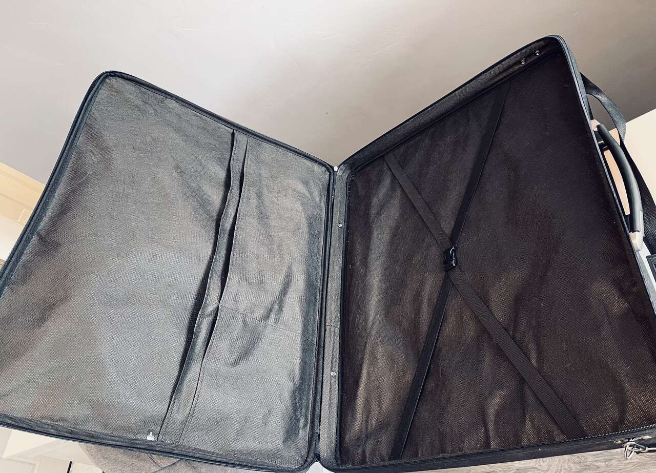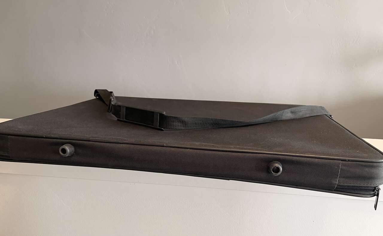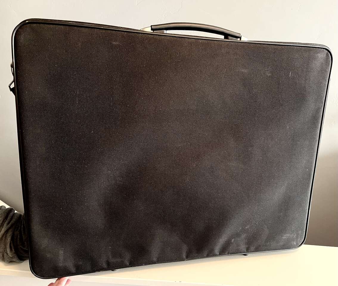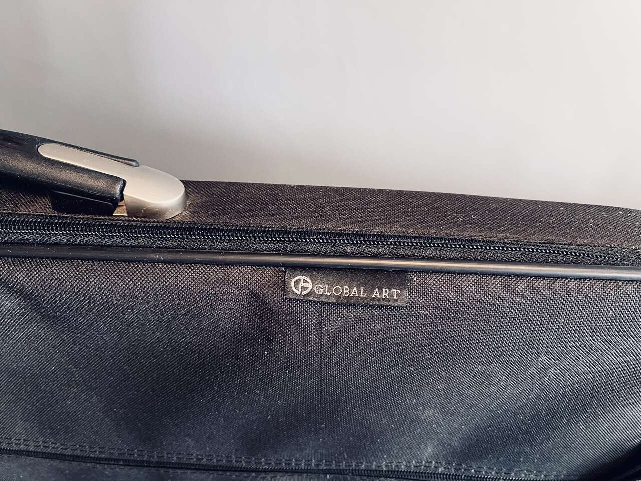 Global Art Portfolio Case. Large size -21" tall, 27" wide, 2" depth. Solid Black color. Top carry handle and adjustable detachable shoulder strap. 2 protective feet on the bottom. 1 large outer zip pocket and 3 open deep interior pockets on one side and buckled criss-cross straps on the other interior side to secure your art/project materials. Durable softsided material for protecting your artwork, photography, presentation materials during transport. Zippers and buckle works smoothly. Lots of life left in this simple, functional portfolio case.
