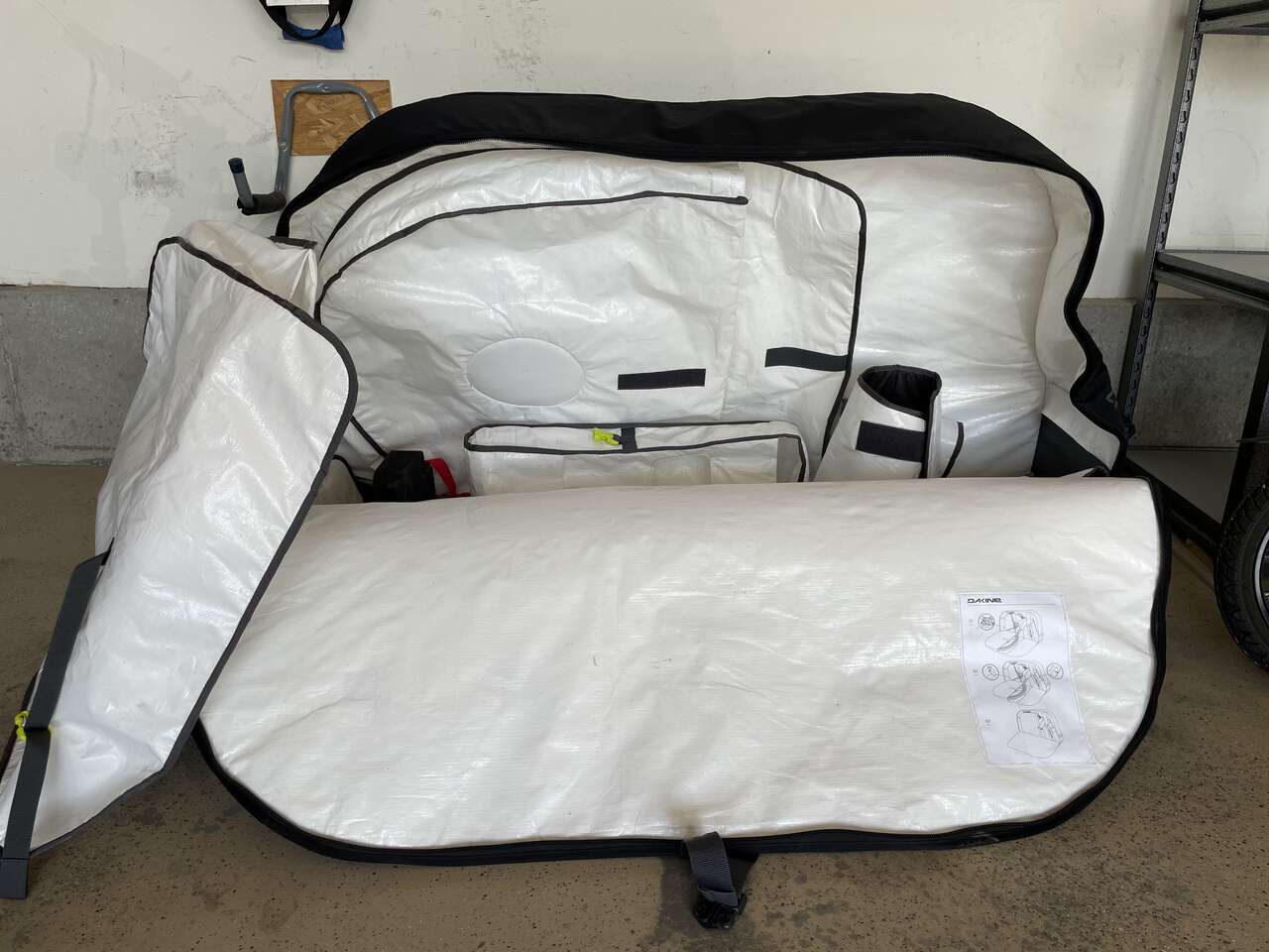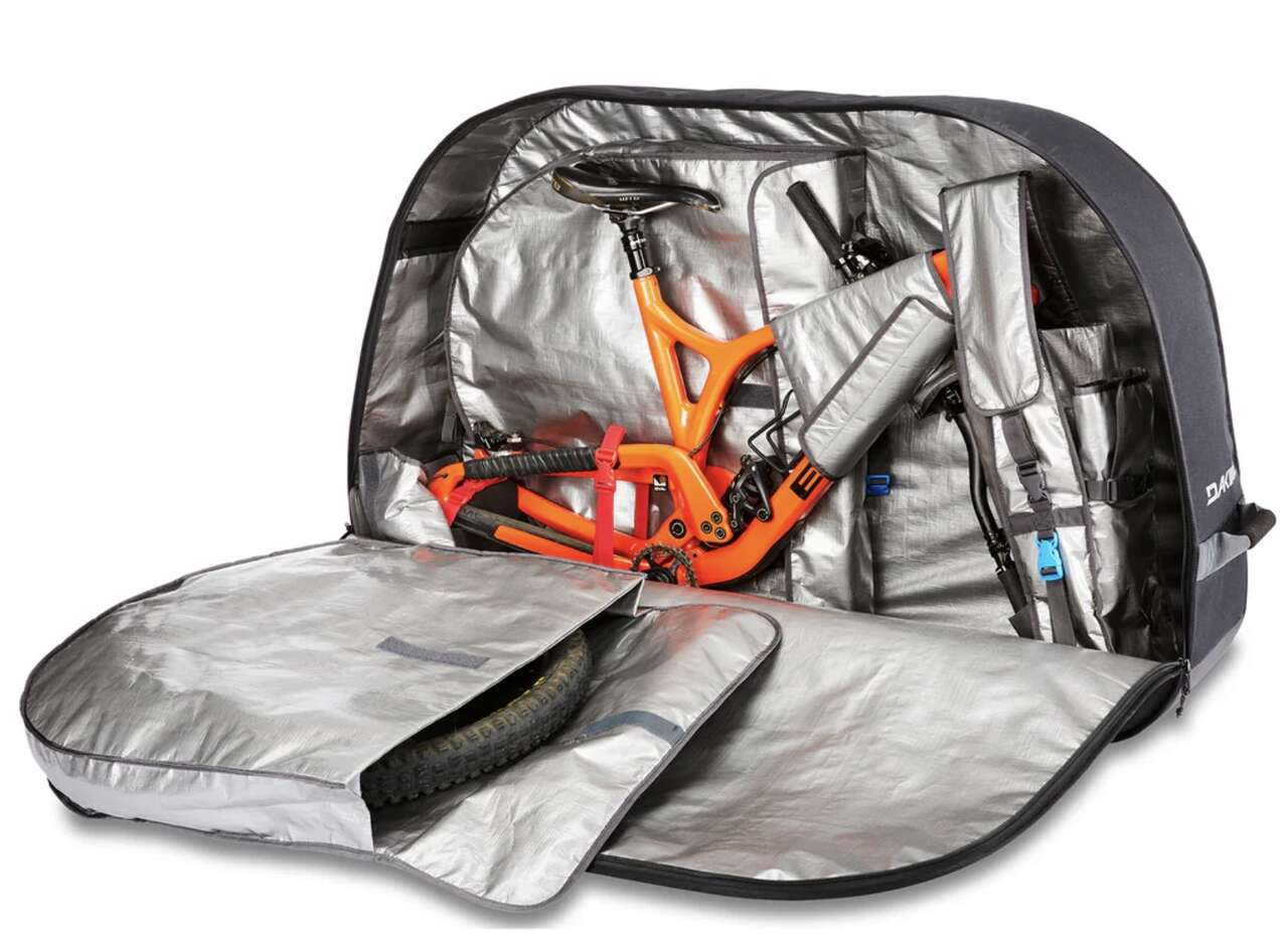 It delivers 360° coverage for mountain, road, downhill and fat bikes. First, the anchoring system and bag frame structure are interconnected to maintain structural integrity and bike safety. Second, bike-specific pads and EVA padding protect critical areas including discs, drivetrain and dropouts. The kit includes wheel and fork bags as well as a roll-up tool bag to keep essential assembly tools and small parts organized. Third, bomber wheels and multiple grab handles makes for smooth transitions, and the bag's collapsible design lets you roll it up for compact storage.