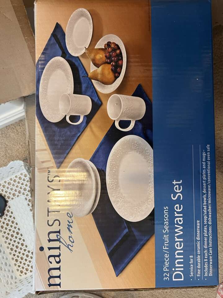 This is a brand new 32 piece dinnerware set of mainstays home/fruit seasons pattern. Never been used still in the box. $80 or reasonable best offer Cash or Venmo only no codes
