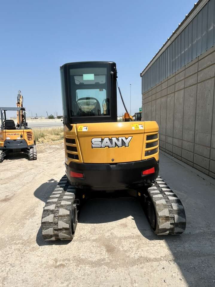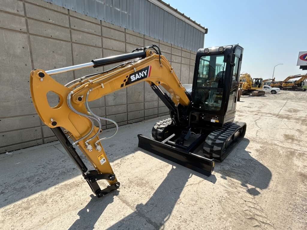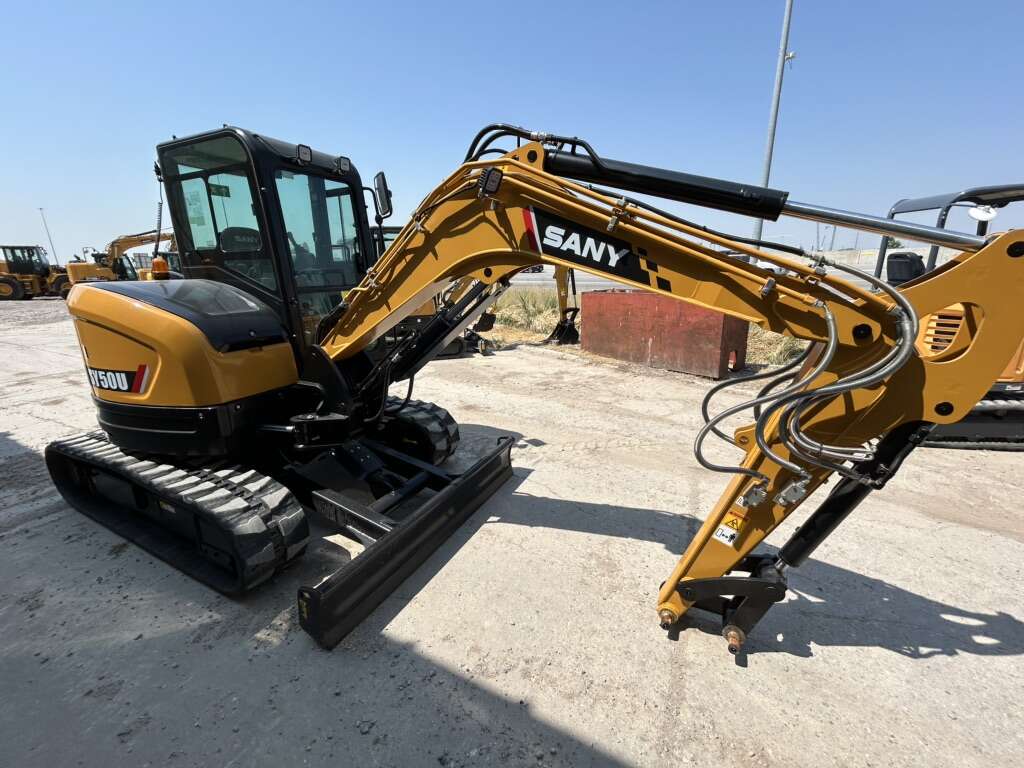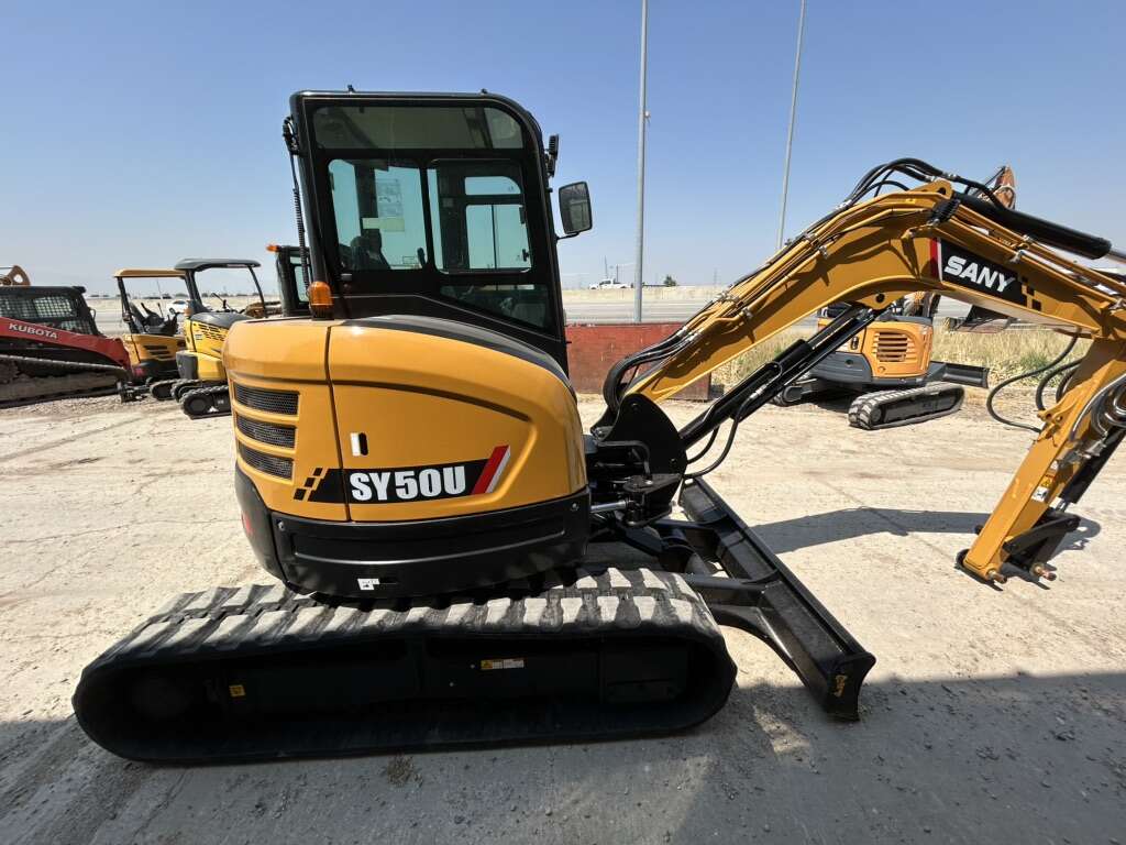 New SY50U SANY mini excavator 11,684 lbs 5 year/5,000 hour warranty Price Includes your choice of bucket Coupler and thumb available at additional cost Atlas Machinery your SANY Authorized Dealer Swing boom True zero tail swing Primary and secondary auxiliary circuits Quick-coupler plumbing to the end of the stick Pilot controls with pattern change valve Load sensing hydraulics Cylinder guards for increased protection 16″ rubber tracks Bright LED lighting package Powerful and reliable Yanmar engine