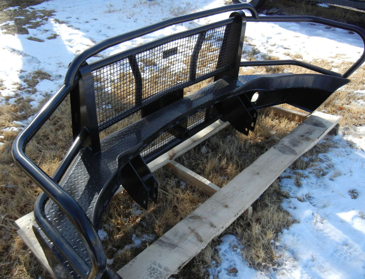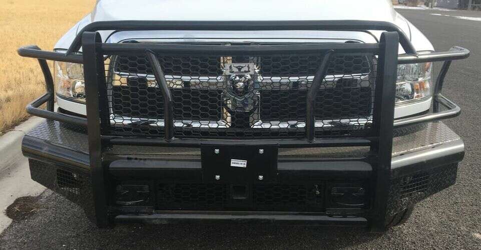 Front Replacement Bumpers made by GR Trailers. Heavy duty bumpers that look great and are well built. Schedule 30 pipe, 14 gauge tread plate, 2 receiver tube Years Available: Dodge 95-25 Ford 99-24 Chevy 99-23 GMC 99-23