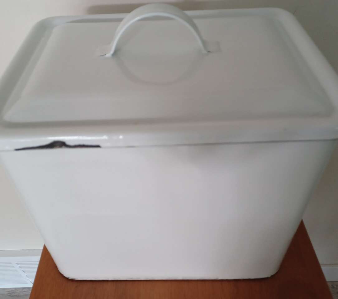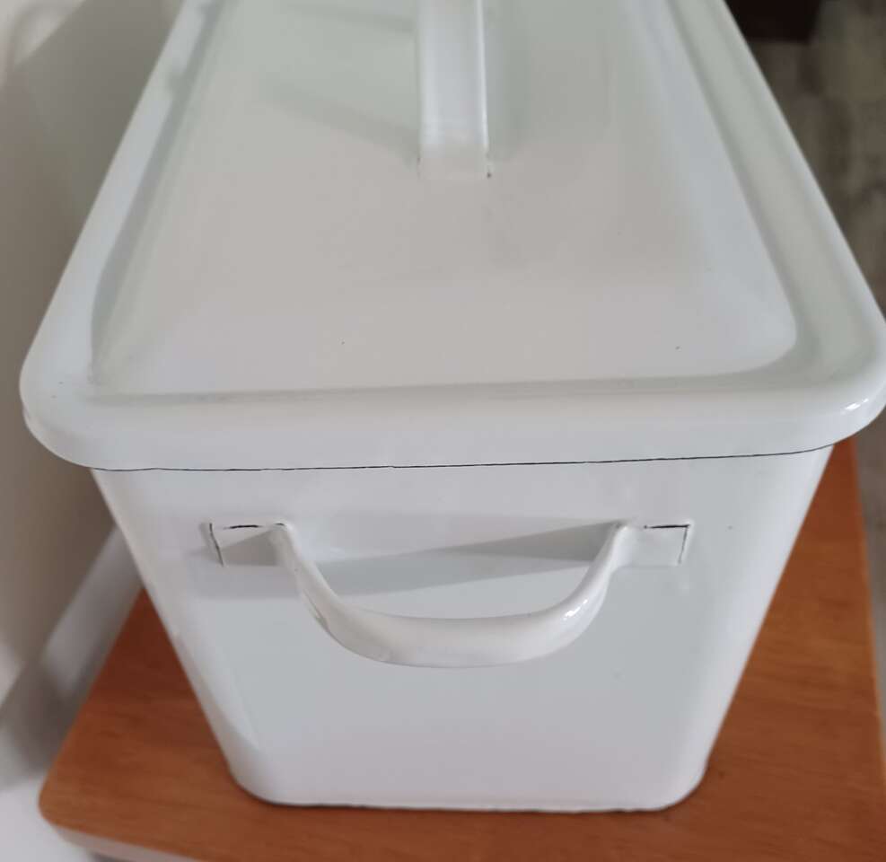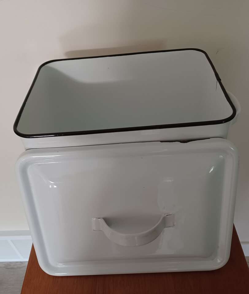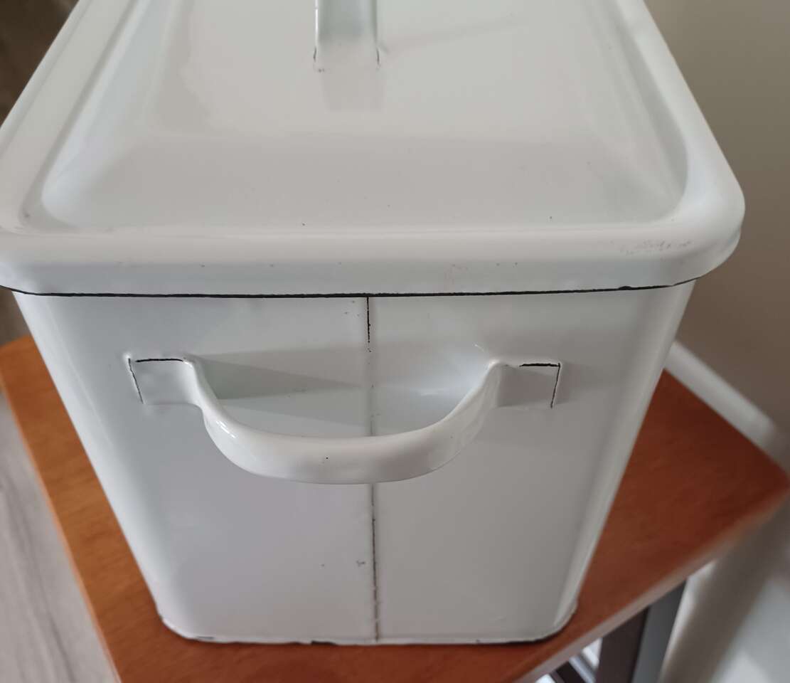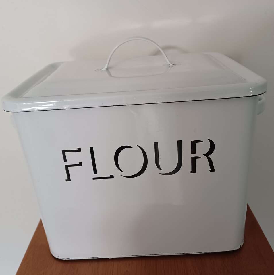 VenmoWhile Enamel "FLOUR" Bin Vintage Look Approx. 14w X 9d X 10h Like New Use it to store bread, pastries, medicine, letters.... $15 Cash Porch pickup only Located in North Salt Lake city by Bountiful No Shipping or Delivery No Hold