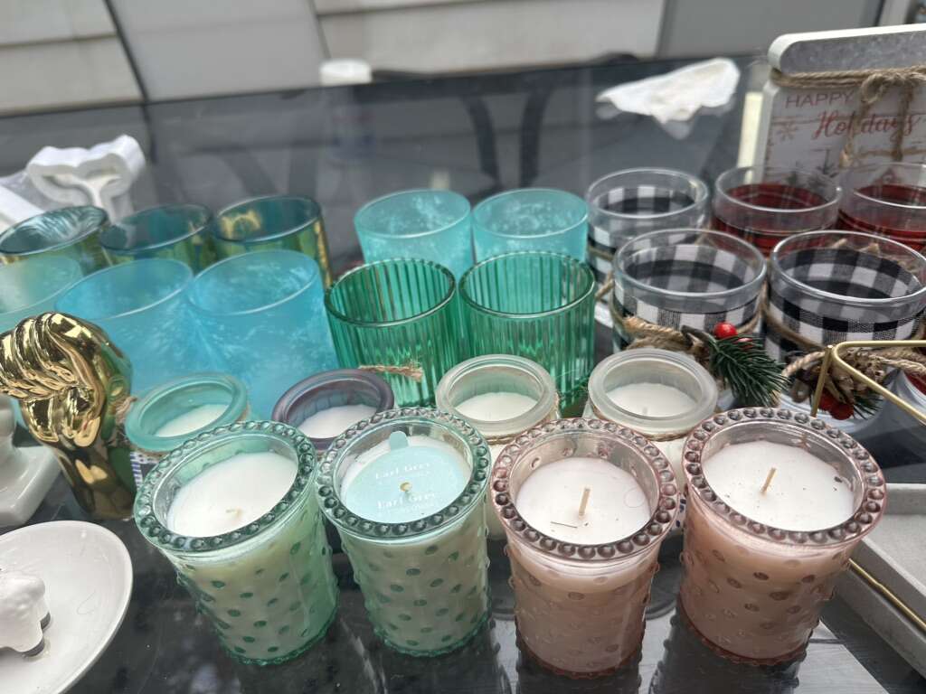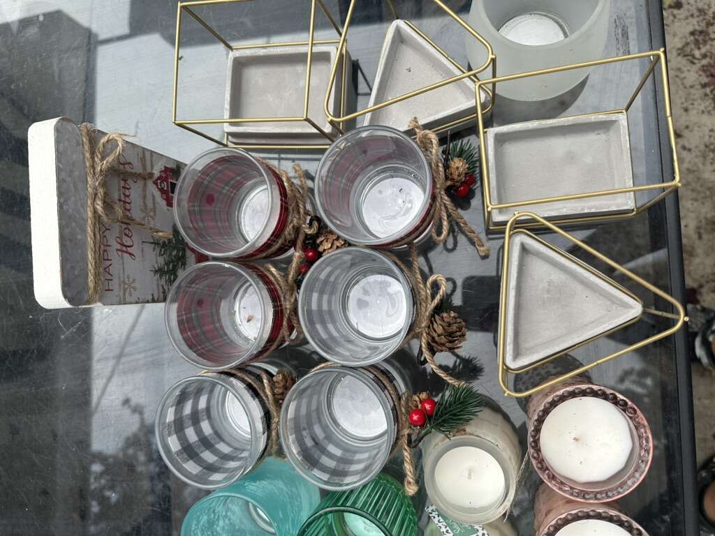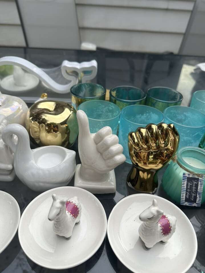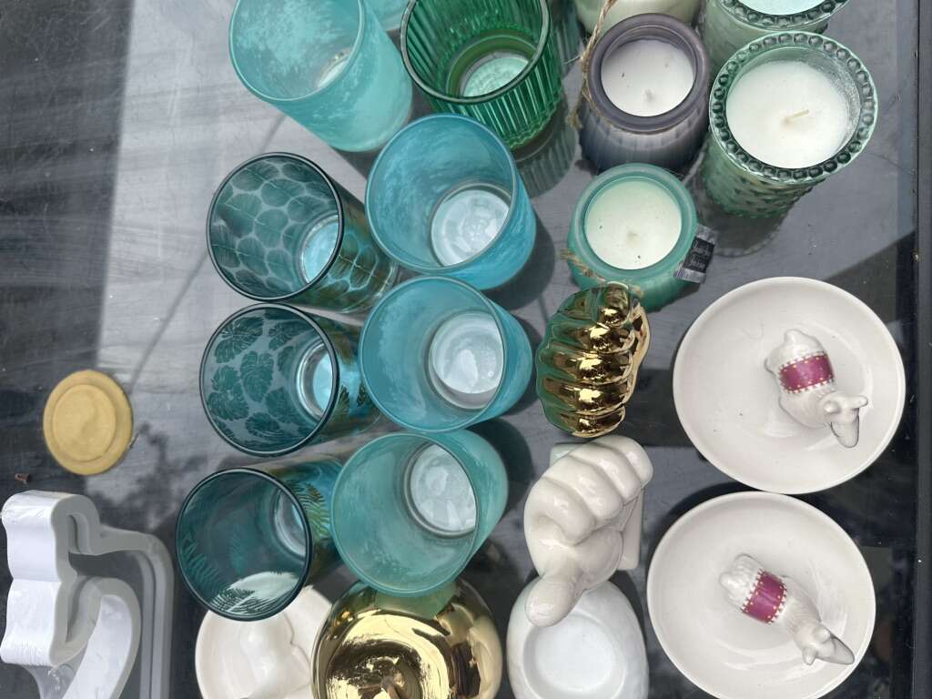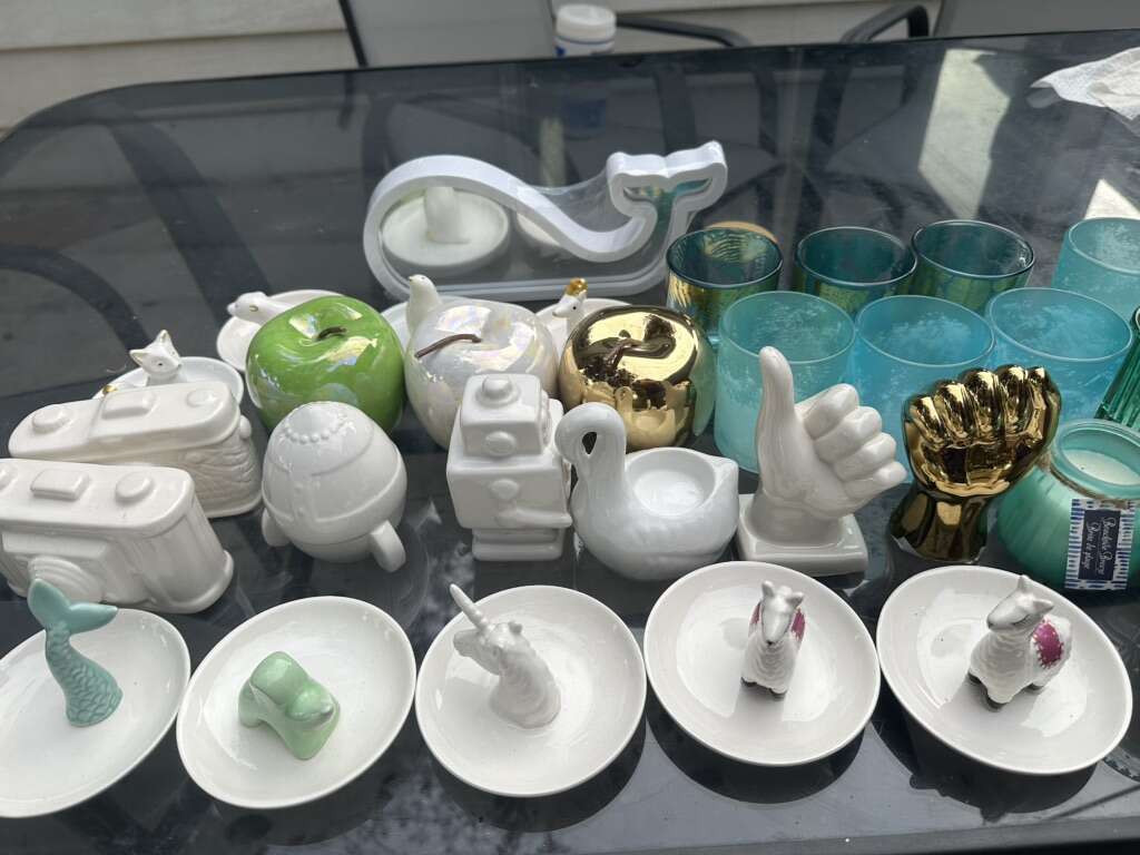 Random assortment of glass jars, candles, ceramic pieces, ceramic trays, shelf items, etc.