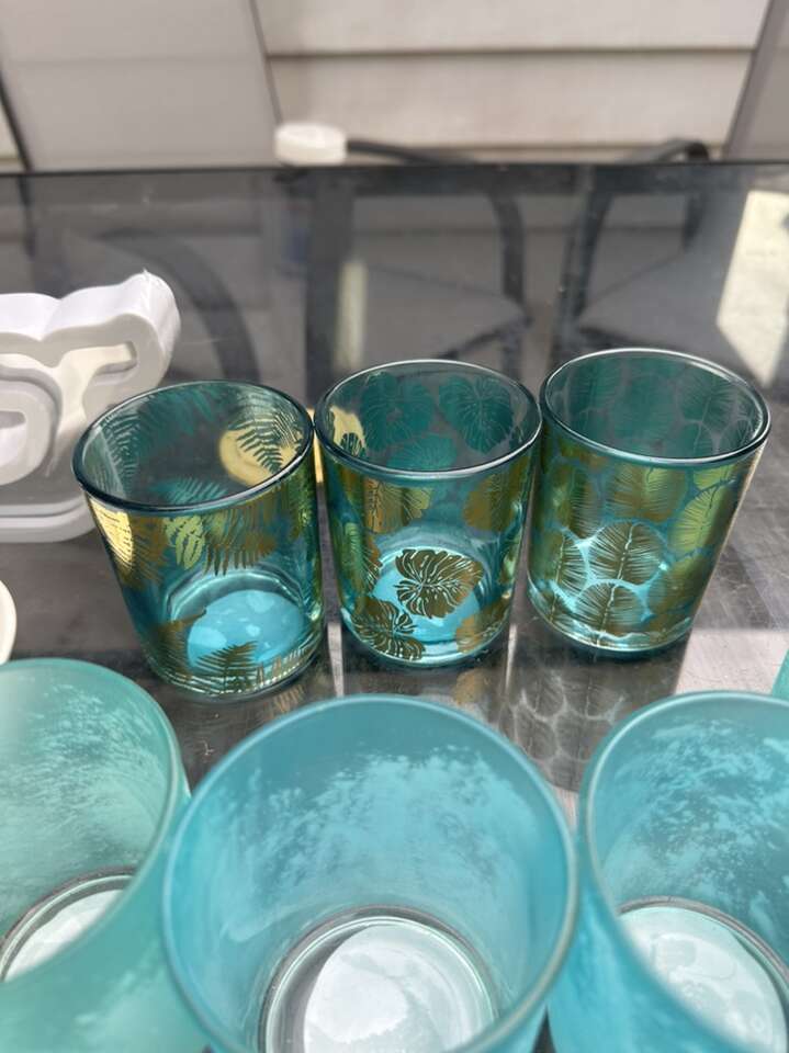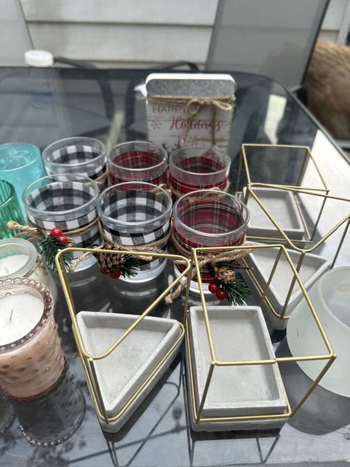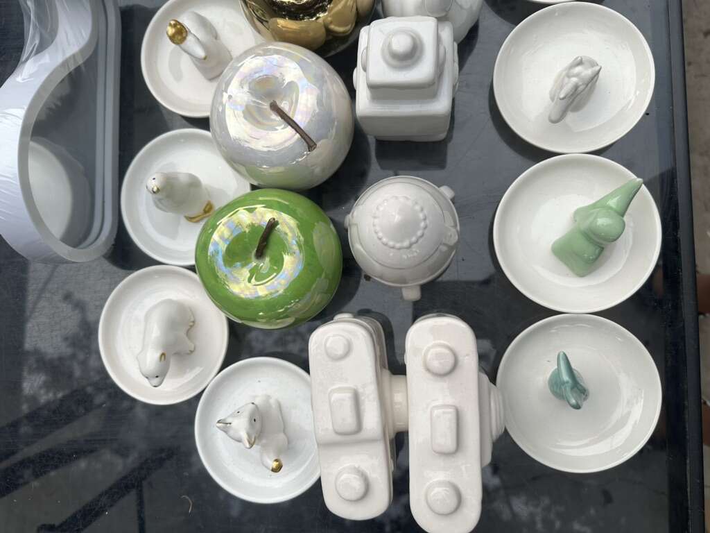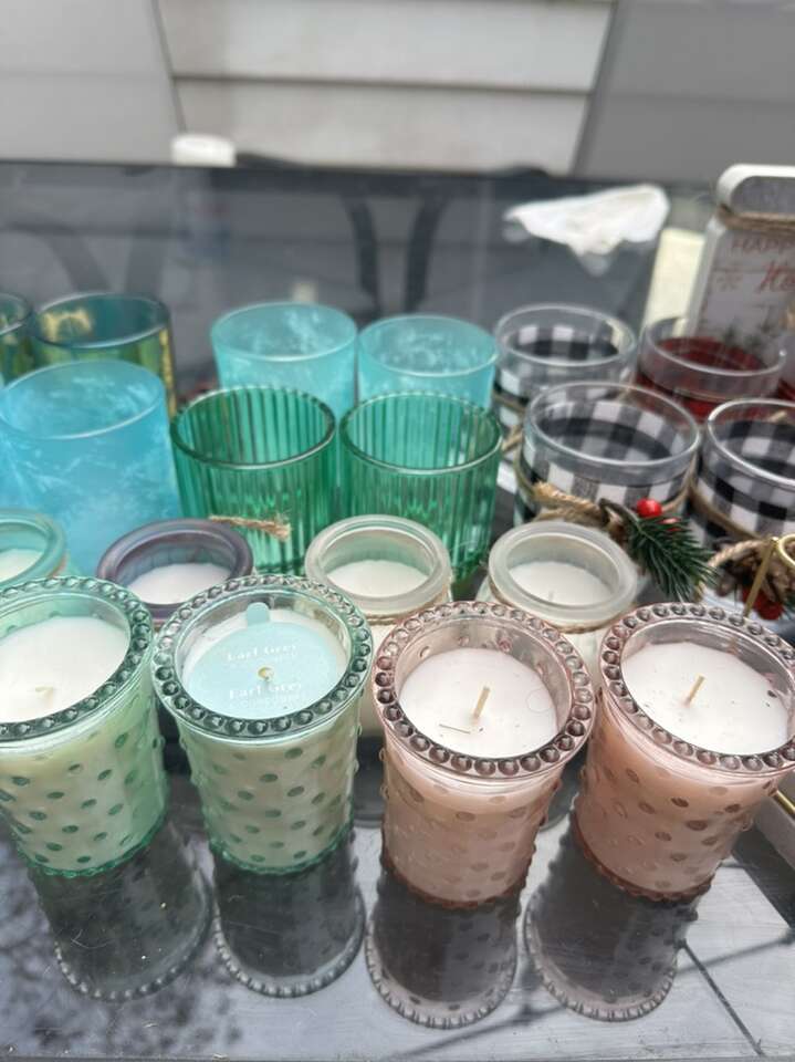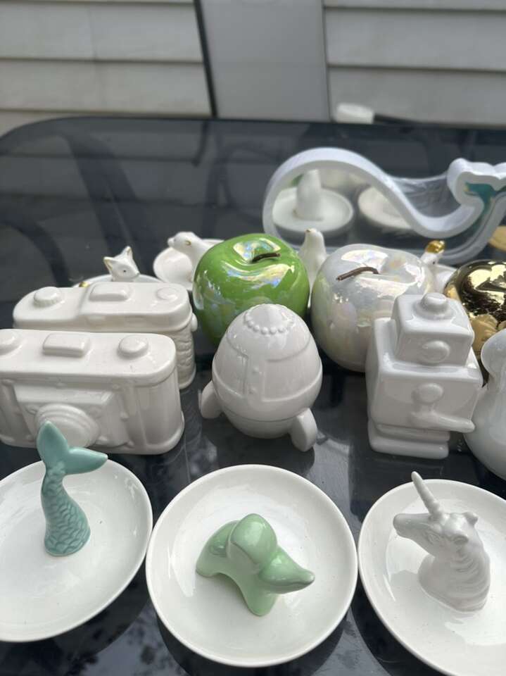 Random assortment of glass jars, candles, ceramic pieces, ceramic trays, shelf items, etc.