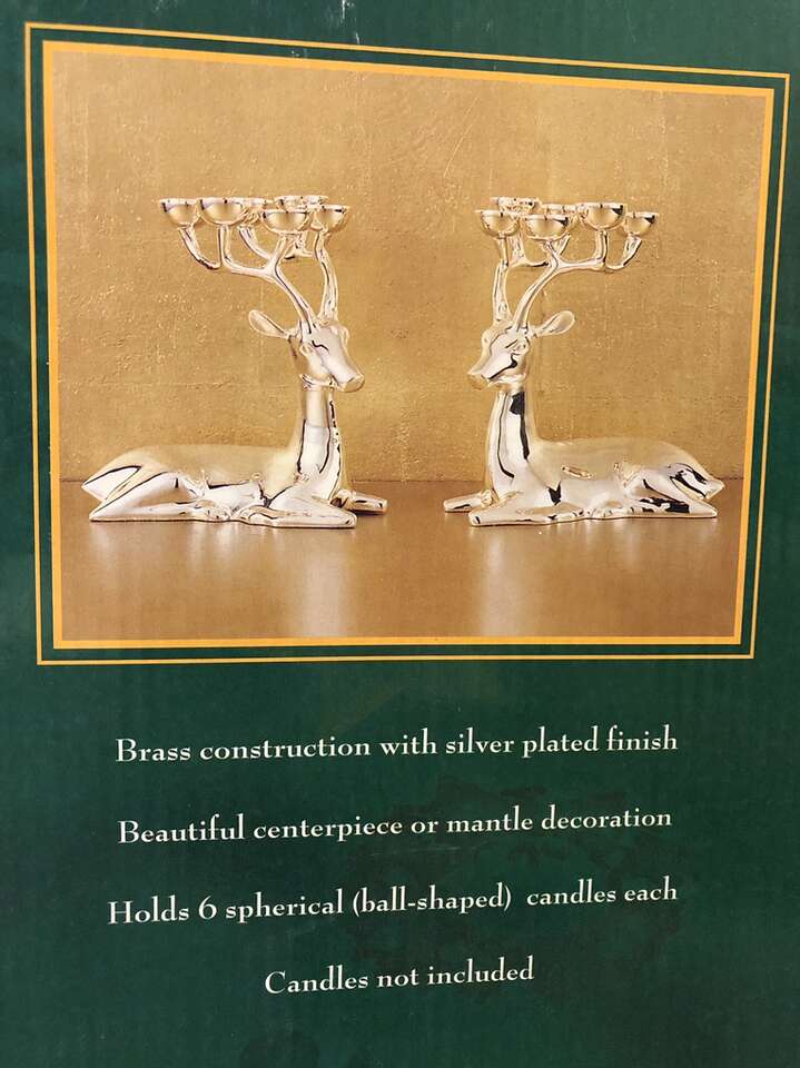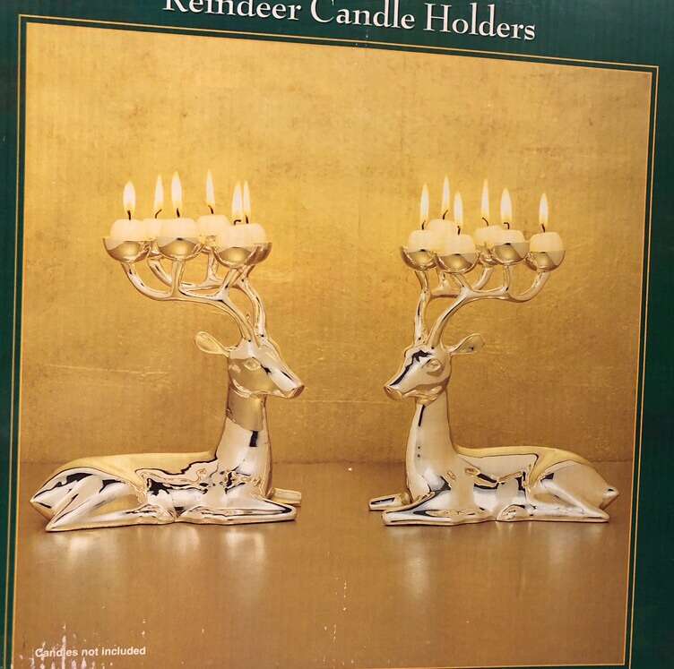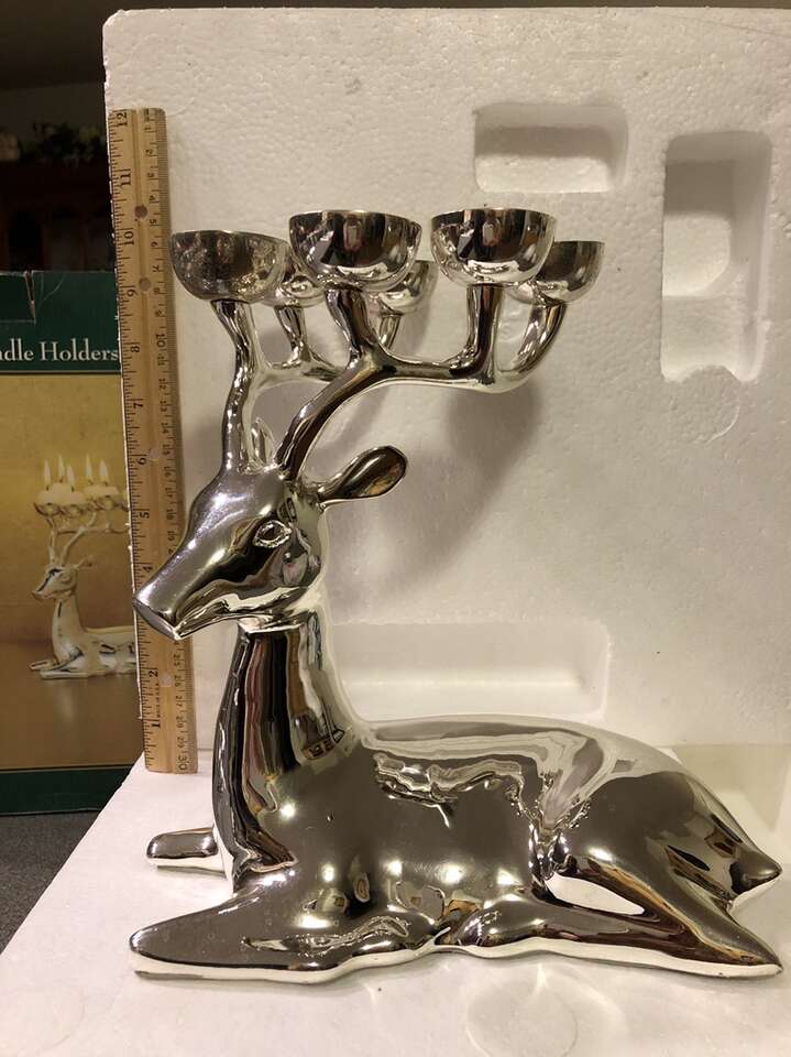 Silver reindeer holds small candles in antlers approx 12” tall