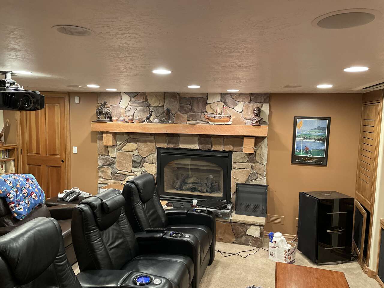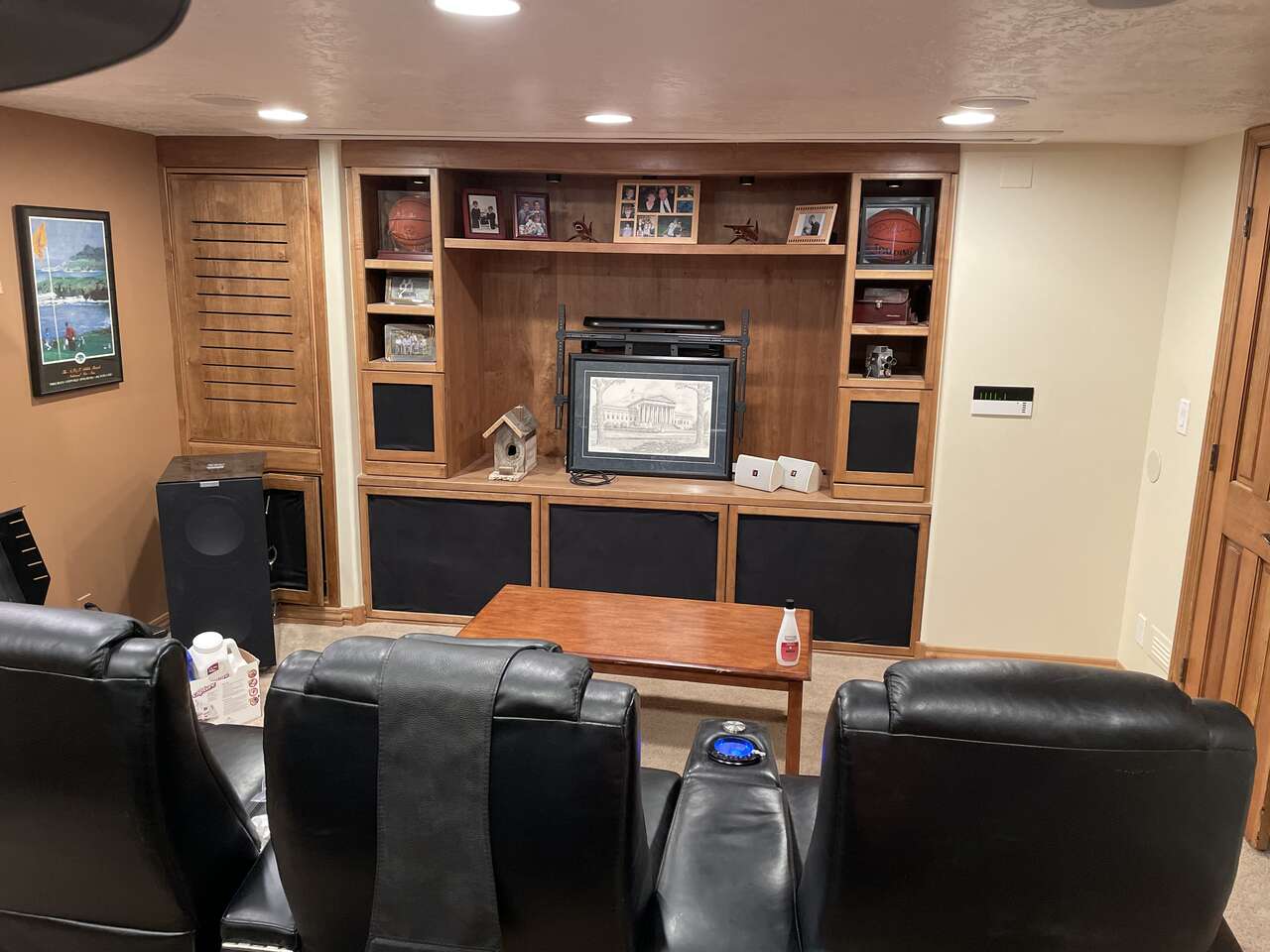 VenmoSelling one row of home theater seating. black leather with power reclinging and led lights on the cupholders and inflatable lumbar support. Center seat will not recline for some reason but parts are available. They have storage in the armrests, USB ports and small tables that fit in the metal support in each arm. they are in good condition. No rips or tears. One seat cannot control the LED accent lighting. Frankly, I would just disconnect all LED lighting. Just not needed. Weighted headrest pads included. The brown seats shown in the pictures have been sold.