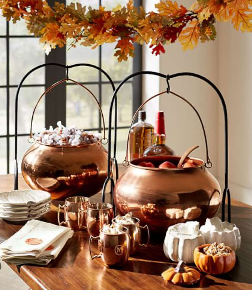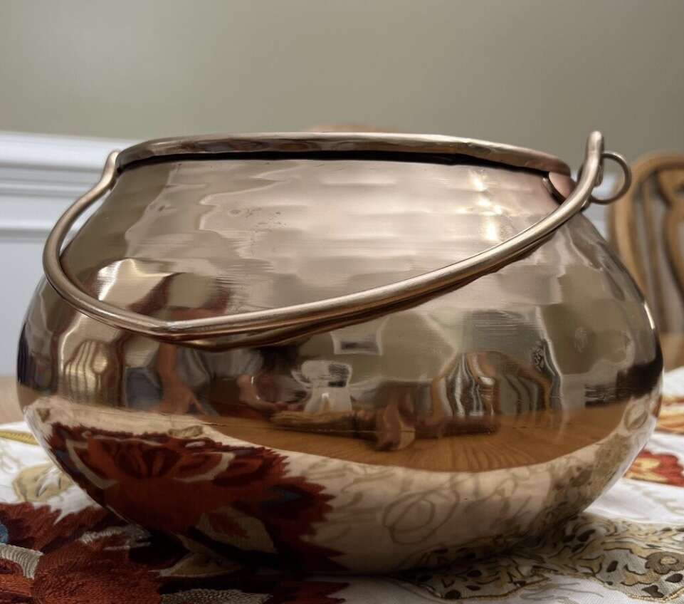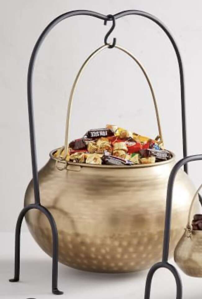 Beautiful Pottery Barn Large Halloween Hammered Gold Witch Cauldron server w/ tall black iron stand. 21" tall, 15" wide, 10" top opening of cauldron. Hand wash. Makes a great large candy server or Halloween decor planter for indoor or covered outdoor areas. This is a large heavy quality item. Will not tip over or blow away. Not intended for use w/ hot liquids, not insulated. I included some styling pictures to give ideas for using this awesome decorative Halloween item. Sadly never used this and no longer have the extra space to keep it. My loss is your gain!
