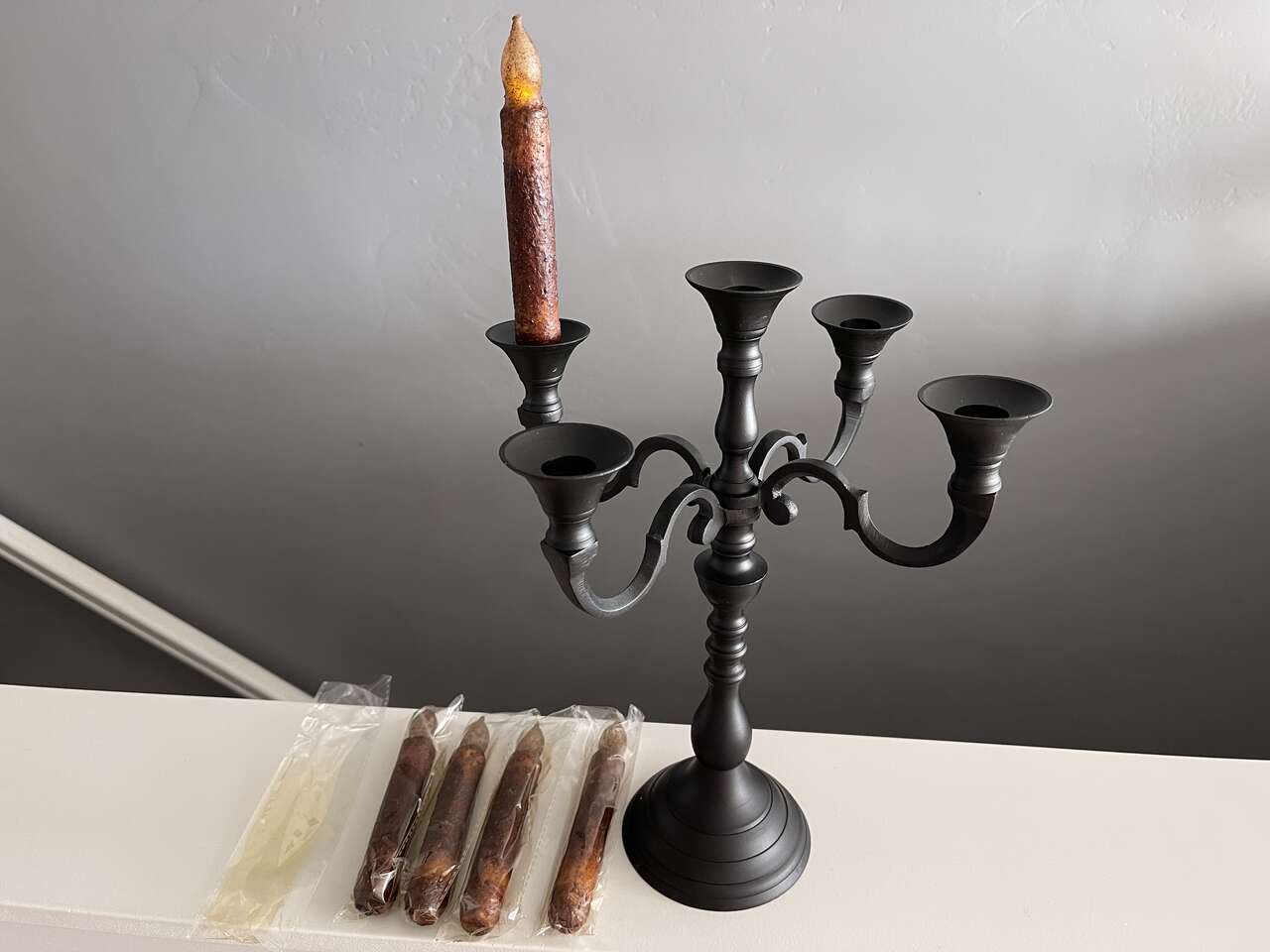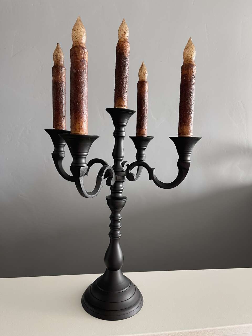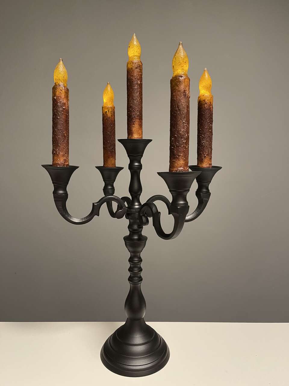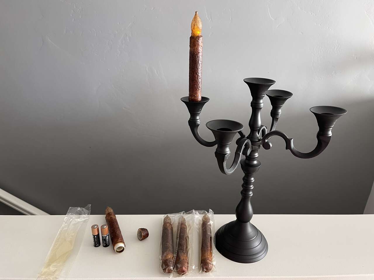 Black Iron Candelabra w/ 5 new spooky flickering rustic led flameless battery powered candles. Candelabra is convertible from 5 arm to 3 arm to single candle holder. (See pics) Nicely weighted and collapsible for easy storage. Set of 5 brown rustic moody flickering led/flameless battery operated candles each take 2 AA batteries (not included). Bottom of each candle unscrews to load the batteries and to turn on/off. No timer or remote.