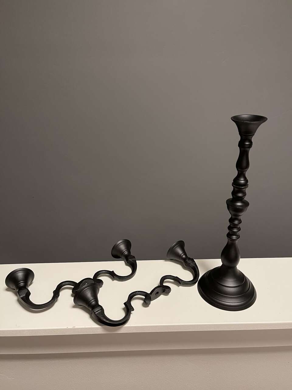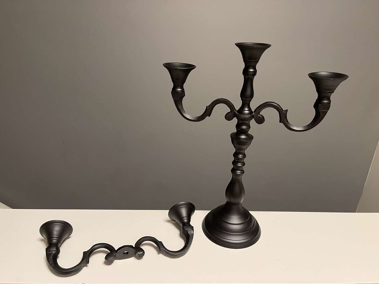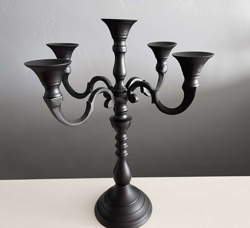 Black Iron Candelabra w/ 5 new spooky flickering rustic led flameless battery powered candles. Candelabra is convertible from 5 arm to 3 arm to single candle holder. (See pics) Nicely weighted and collapsible for easy storage. Set of 5 brown rustic moody flickering led/flameless battery operated candles each take 2 AA batteries (not included). Bottom of each candle unscrews to load the batteries and to turn on/off. No timer or remote.