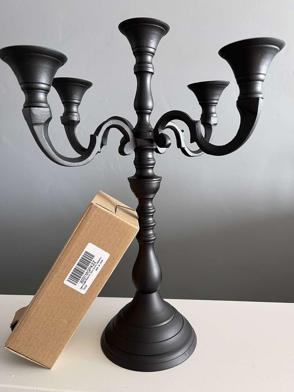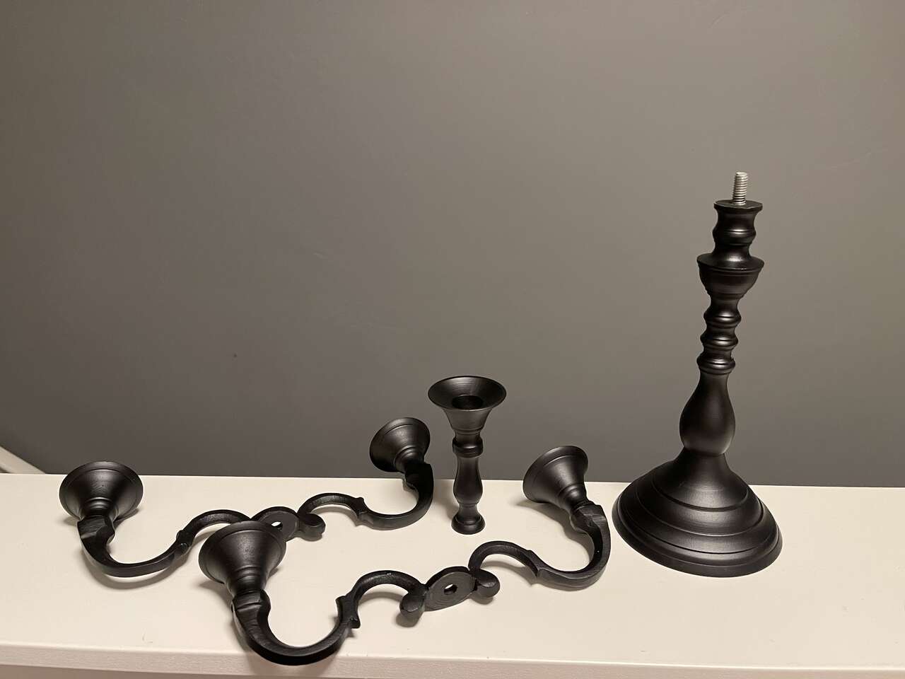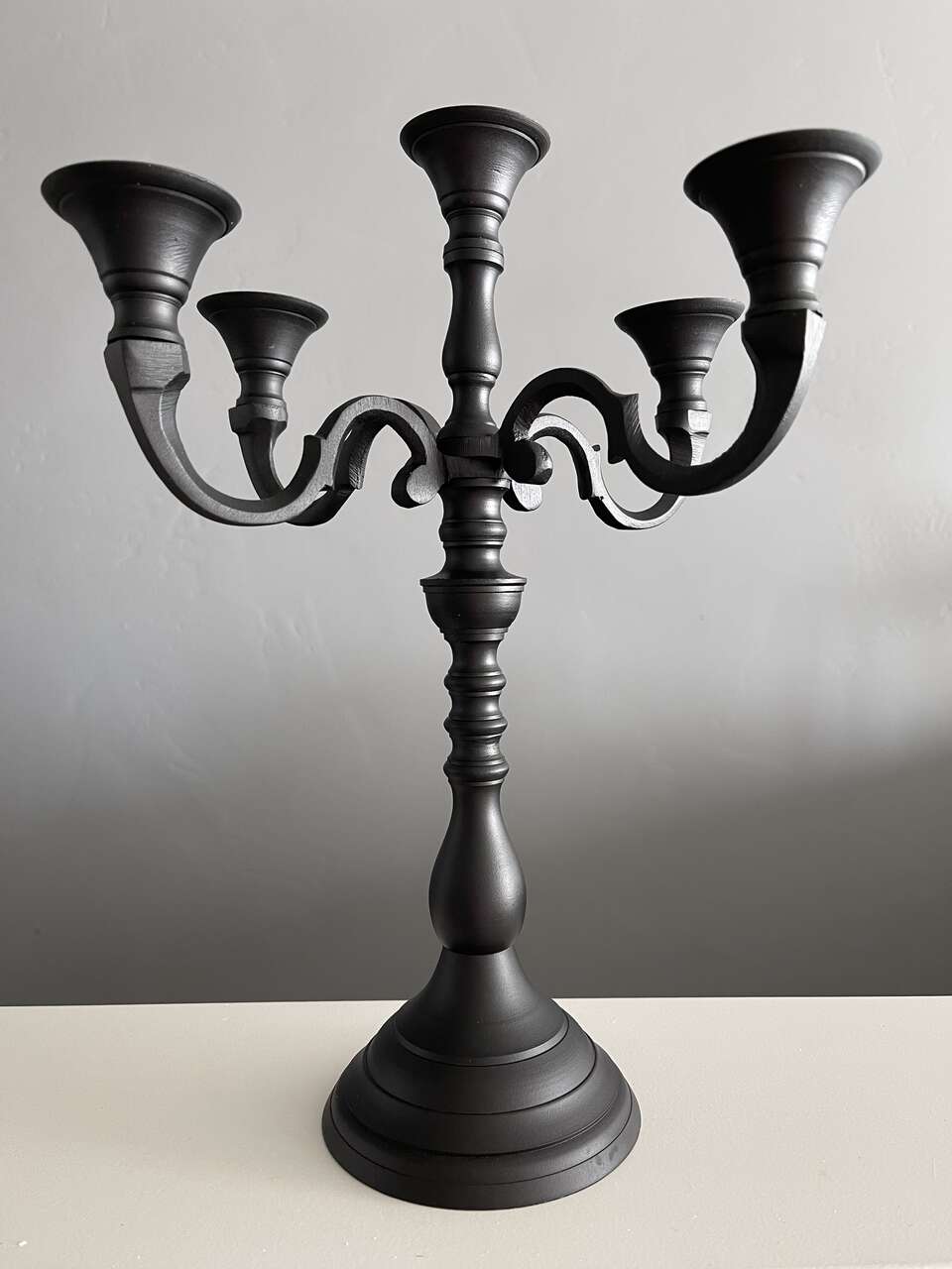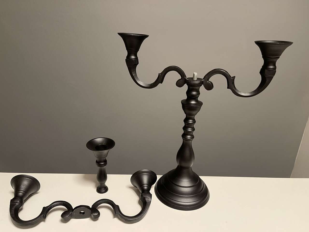 Black Iron Candelabra w/ 5 new spooky flickering rustic led flameless battery powered candles. Candelabra is convertible from 5 arm to 3 arm to single candle holder. (See pics) Nicely weighted and collapsible for easy storage. Set of 5 brown rustic moody flickering led/flameless battery operated candles each take 2 AA batteries (not included). Bottom of each candle unscrews to load the batteries and to turn on/off. No timer or remote.