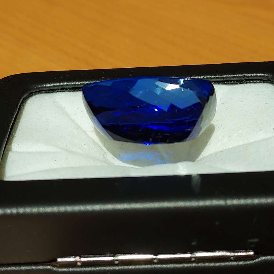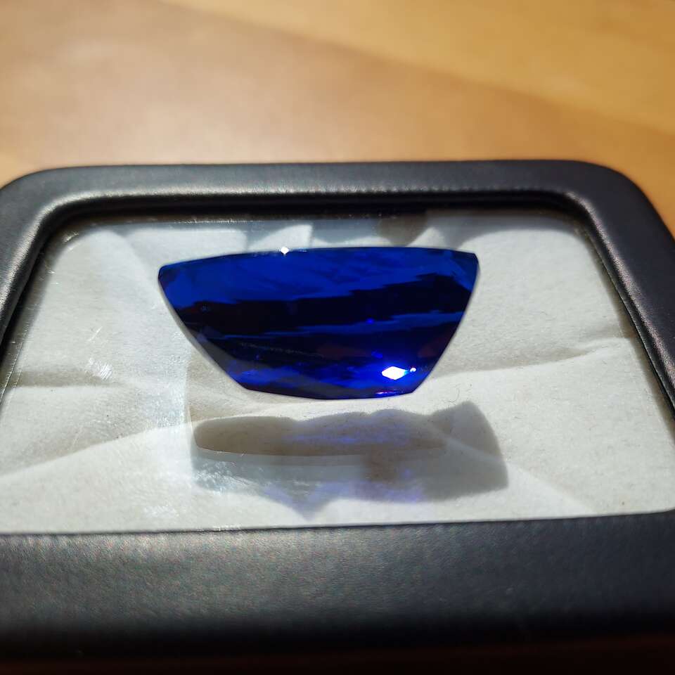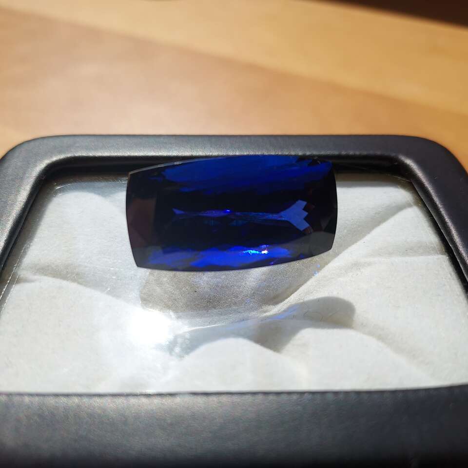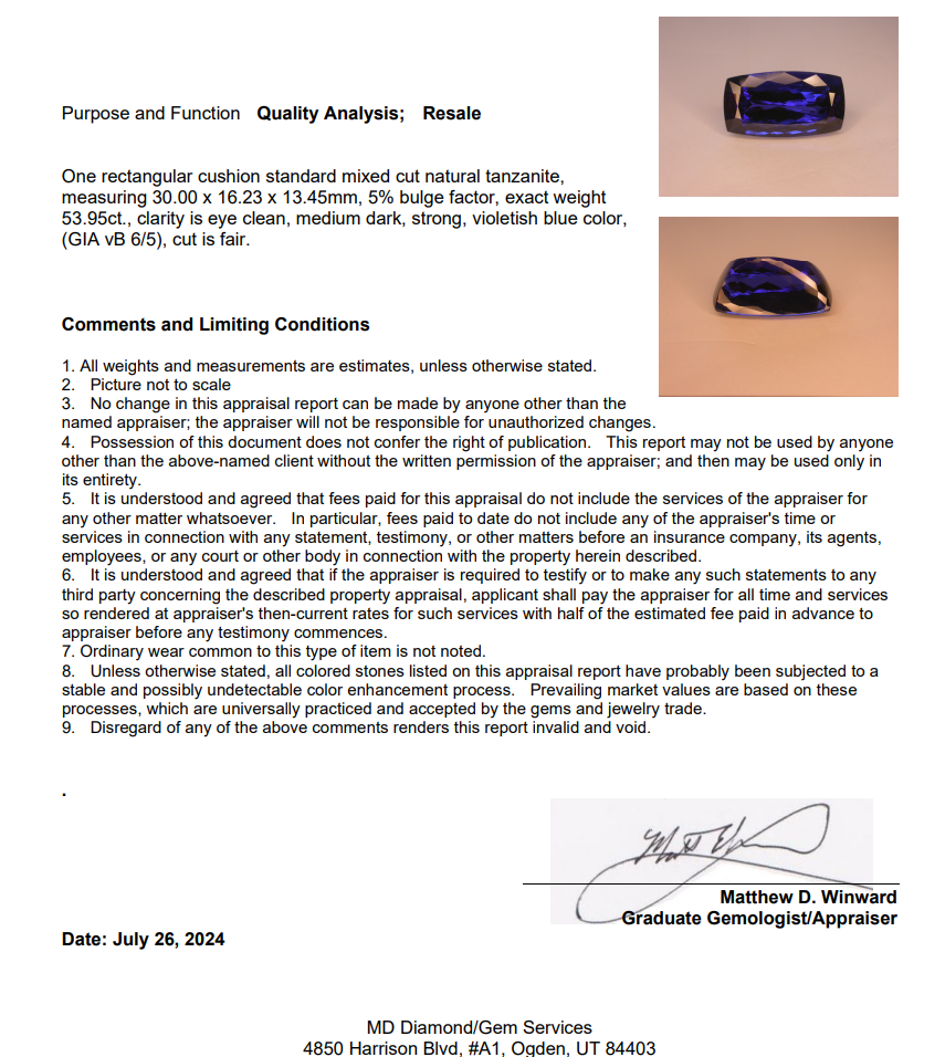 53.95ct., clarity is eye clean, medium dark, strong, violetish blue color,