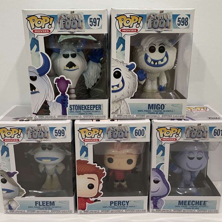 This collection contains figures from Warner Brother's Small Foot! Each figure is new and comes in it's original display box. All boxes are in near mint condition, except box # 597 (Stonekeeper) has a 1/2 inch tear at the top (shown in picture). Each figure is approximately 4 inches tall. Figures included in this set are Stonekeeper, Migo, Fleem, Percy, and Meeche! Great addition to your Funko POP collection!
