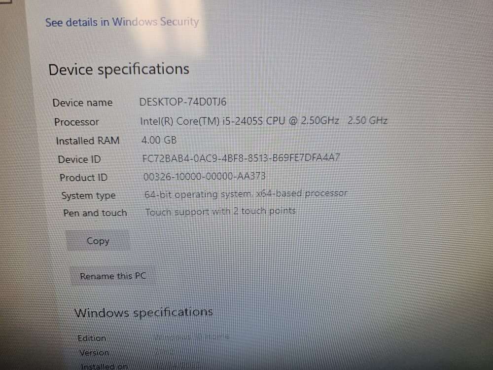 Works perfectly fast all in one pc. Takes 10 seconds to get to log in screen. Windows 10. Intel i5. 4gb ram. Beats audio built in. Webcam. 1tb hdd. Touch screen.