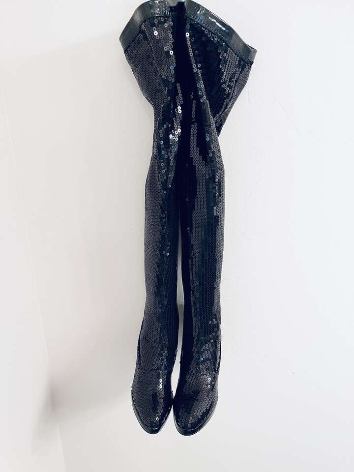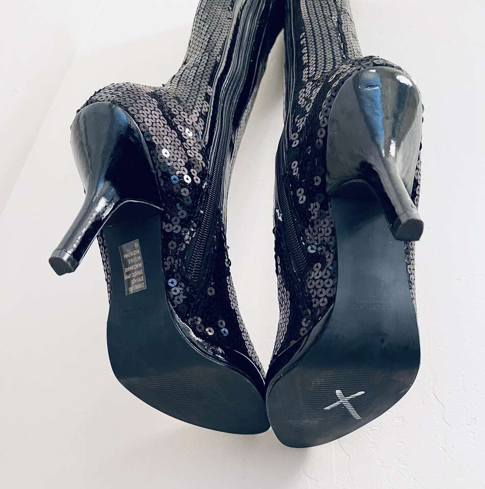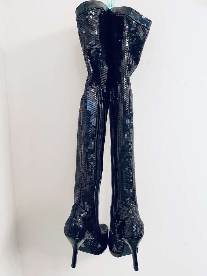 Beautiful sparkly Black all over sequin over-the-knee thigh high platform heeled Halloween dress boots! Slim sexy fit w/ some stretch. Pull on w/ inner side zippers Almond toe, 4" heel, 1/2" platform sole.