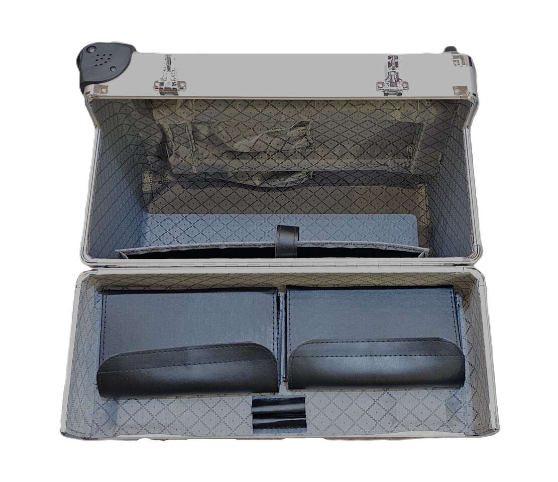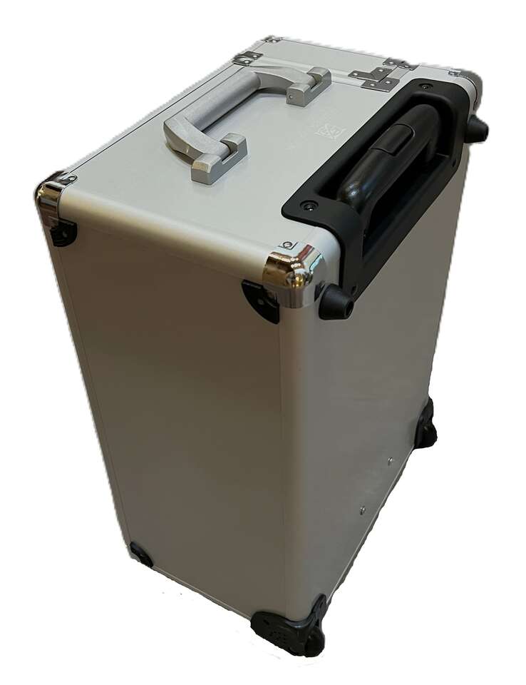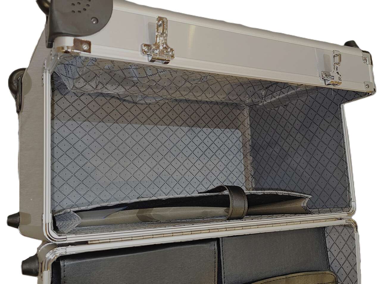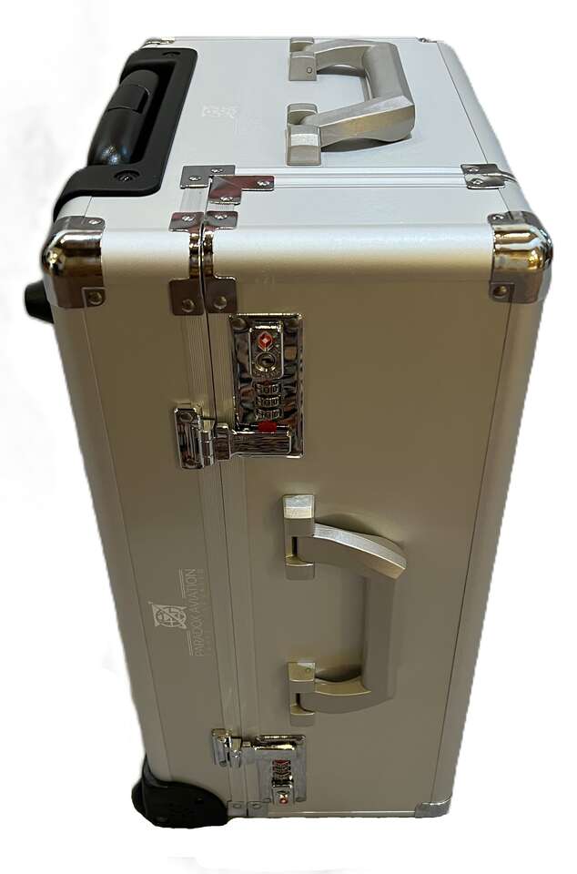 Outside is bespoke aluminum skin with reinforced corners for the bumps of being on the road. Unlike the old leather cases ours rolls on two edge mounted inline skate wheel assemblies! It has a long multi-position retractable handle which is comfortable for any height pilot. Everything you need is accessed behind one clamshell door. We designed our door specifically to allow full access but also be able to be opened while in the flight deck seat by one hand. All of this while not interfering with the limited space available on most modern flight decks. The lid has a tongue and groove closure like our roll aboards so even if left out in the rain or snow or hit with a water hose, will stay dry inside. If you set your case down in glycol or snow or mud everything inside is safe and secure.