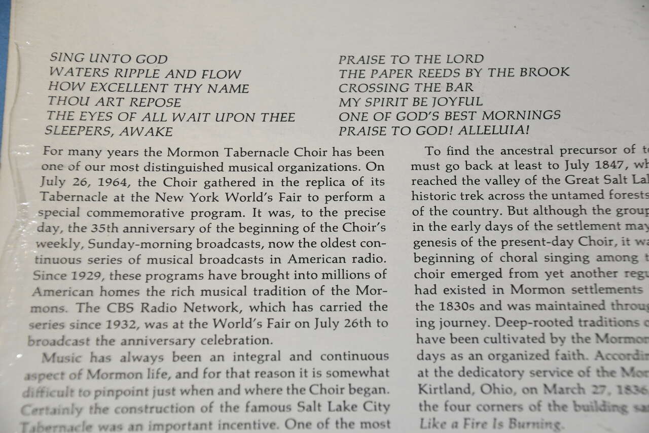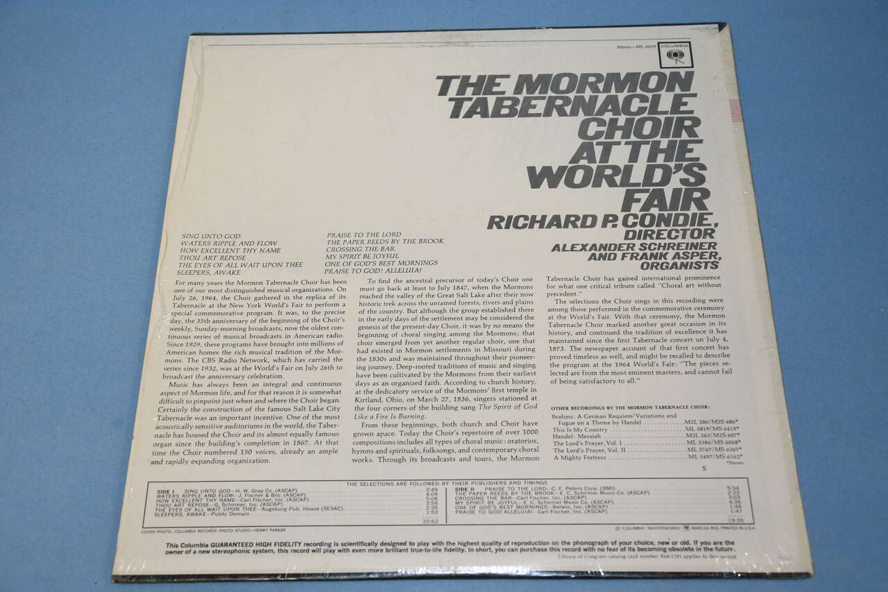 This Vintage 1964 "The Mormon Tabernacle Choir at the World's Fair" Vinyl Record is from a smoke free home. The cover is still in plastic. Questions??? Please ask.