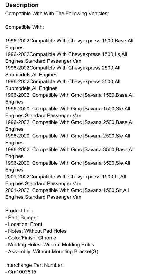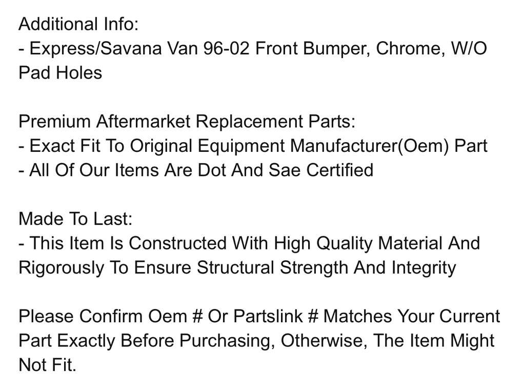 Description- Front chrome steel bumper for 1996-2002 Chevrolet Express/GMC Savana 1500/2500/3500 vans. See photos for more product information and specifications.