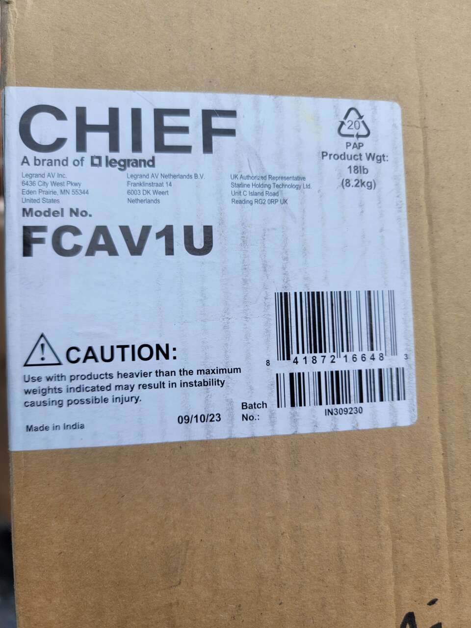 New in box Chief Manufacturing, Pull Hardware, Black Wall Mount Up to 11.54 inch Extention from Wall (FCAV1U).