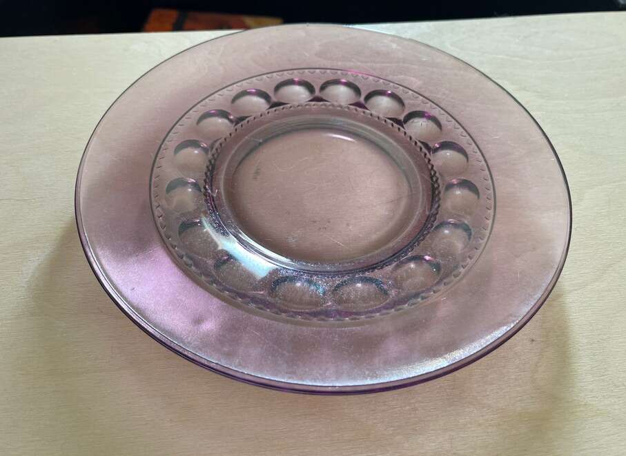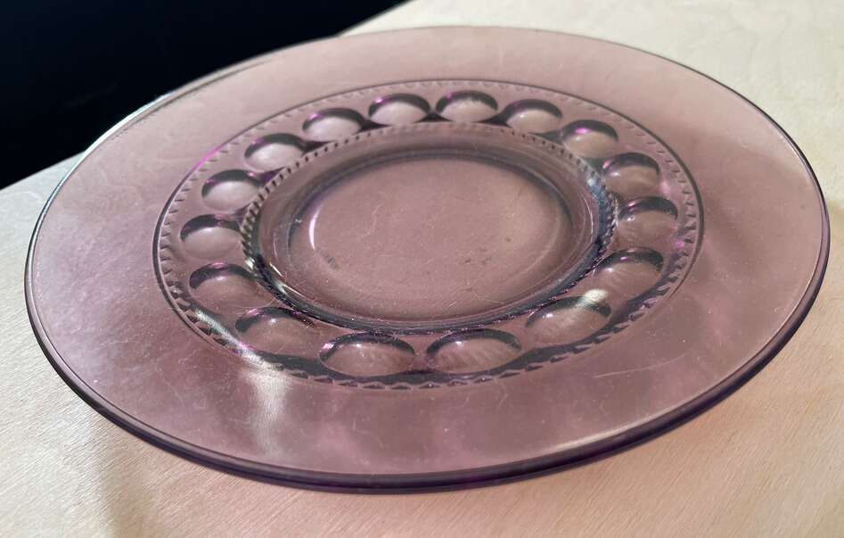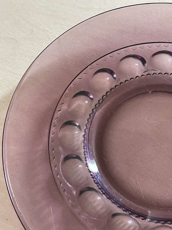 This Luncheon Plate is a classic piece of mid-century modern style. The plate measures 8.25 in diameter and is part of the King's Crown Cranberry pattern made by Tiffin-Franciscan, possibly Indiana Glass. The plate is clear with a cranberry flash band and was manufactured in the United States using a technique called flash, which involves pressing and blowing the glass. The plate is in excellent vintage condition and is perfect for adding a touch of elegance to any meal.