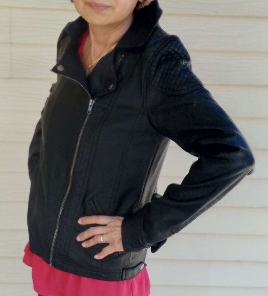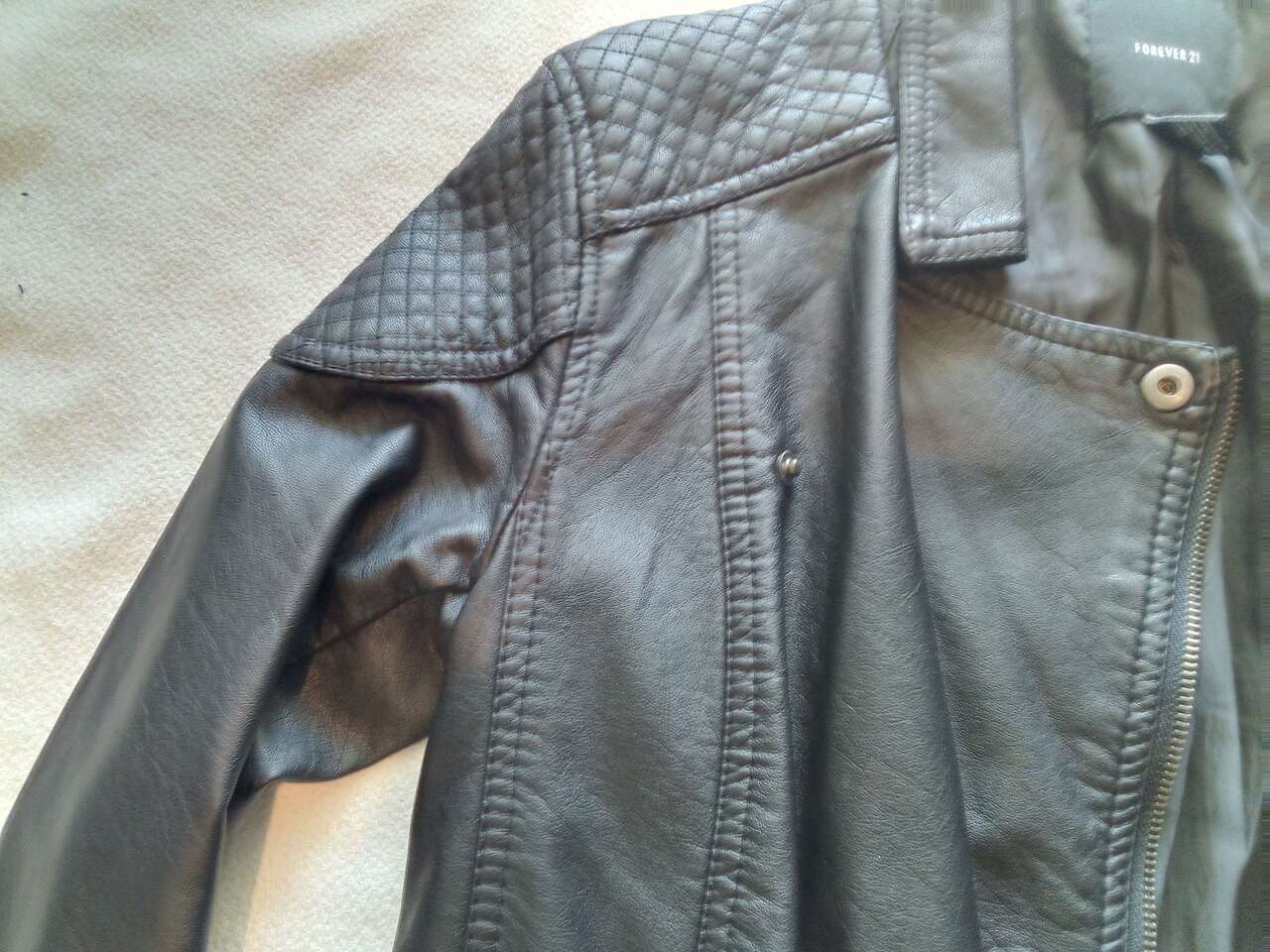Elevate your style with this size medium beautiful black faux leather jacket from Forever 21. Crafted with high-quality faux leather and lined with polyester, this motorcycle jacket is perfect for any occasion.