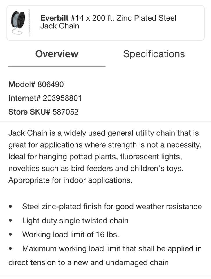 Description- 200’ Roll of #14 zinc plated steel jack chain. See photos for more product information and specifications.