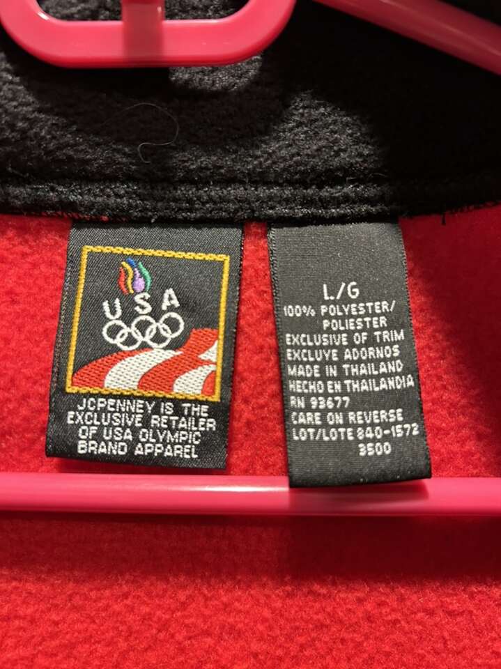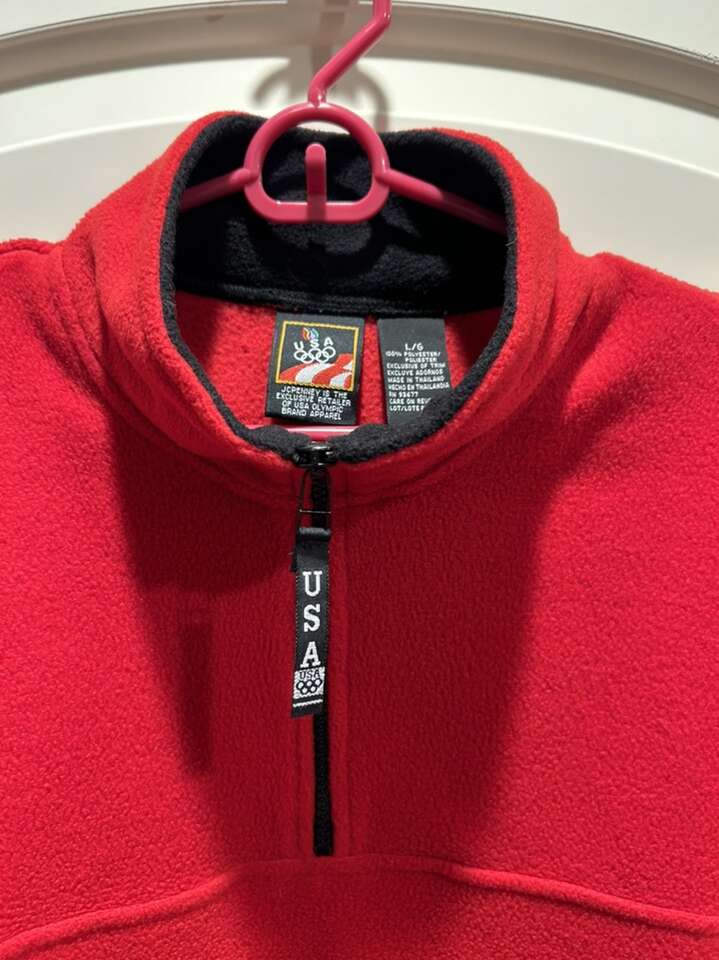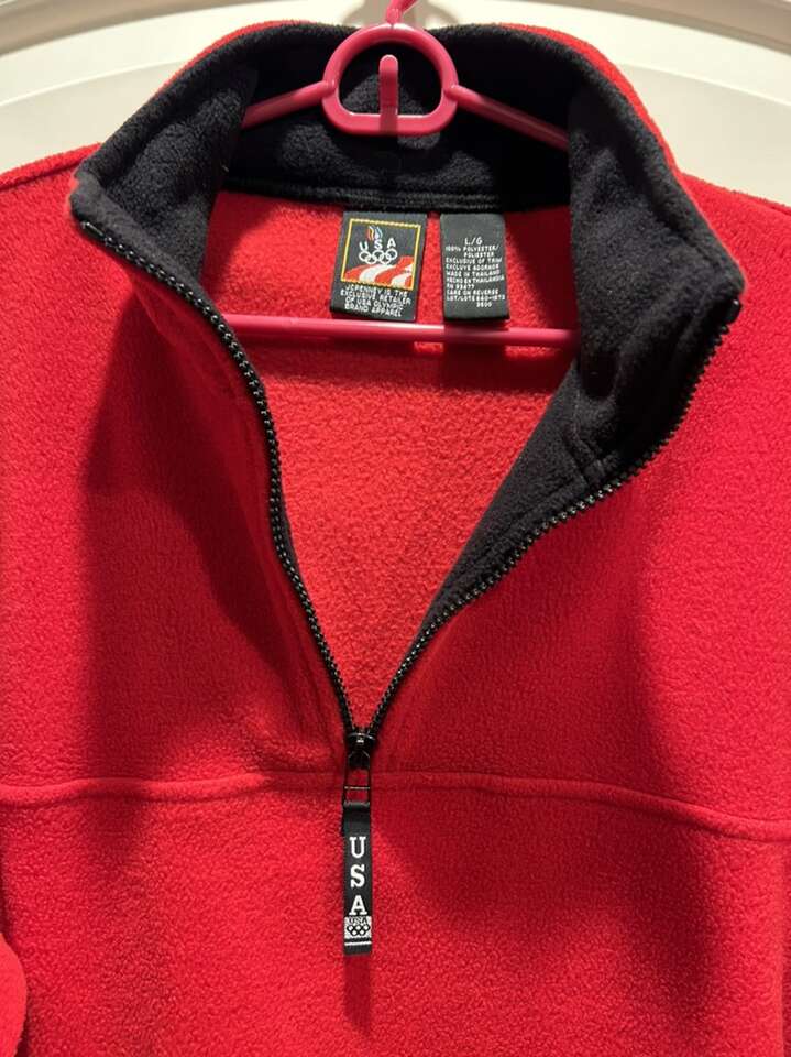 VenmoLike new men’s size large red fleece Quarter zip pull over. Vintage from JCPenney‘s. This is part of their Olympic line for the USA. In pristine new condition. Two side pockets lined with black fleece around the neck. Clean. Smoke-free home. Cash or Venmo. Porch pick up from Alpine.