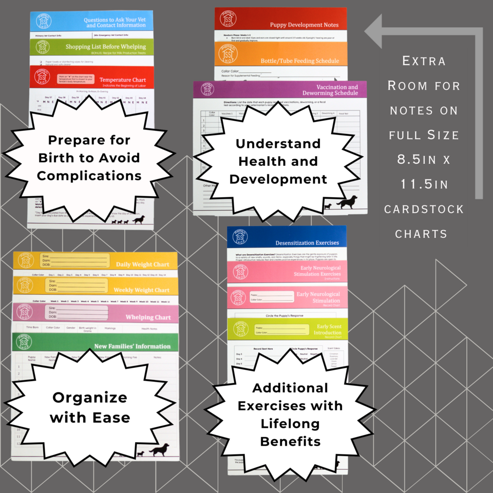 The birthing kit includes 14 infographics/charts. Reduce stress by learning: how to encourage milk production, what questions to ask your vet, and how to recognize when labor is starting. Learn about typical puppy development and how to conduct 3 essential exercises to help puppies decrease fear/anxiety, develop their sense of smell, and live healthier lives. Stay organized by recording: puppies’ weights (daily and weekly), supplemental feedings, vaccination or deworming, and new families’ information.