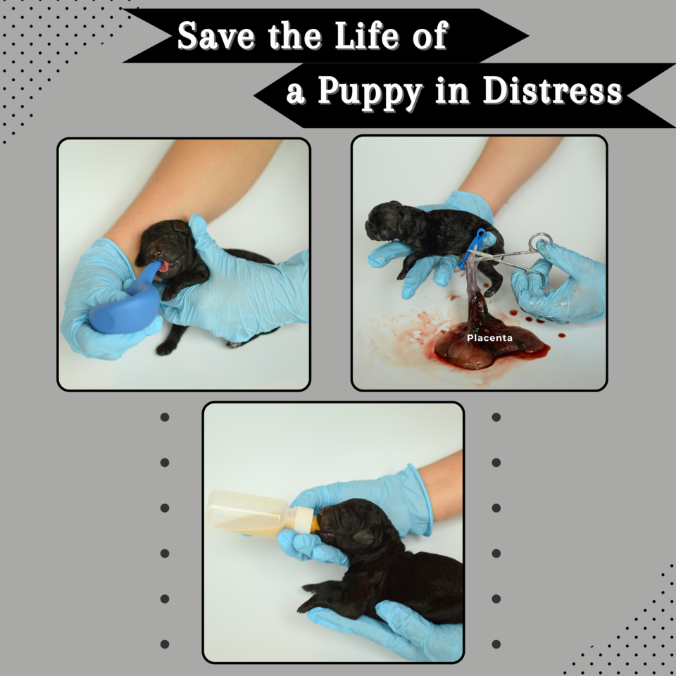A bulb syringe can help a puppy begin breathing- squeeze the fat end, place the thin end into the puppy’s mouth or nose, then release the fat end to create a suction effect, clearing out amniotic fluid.