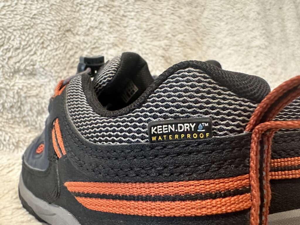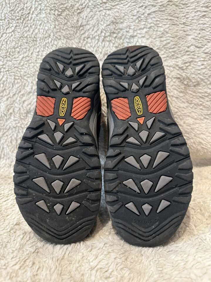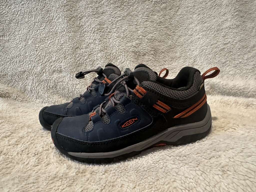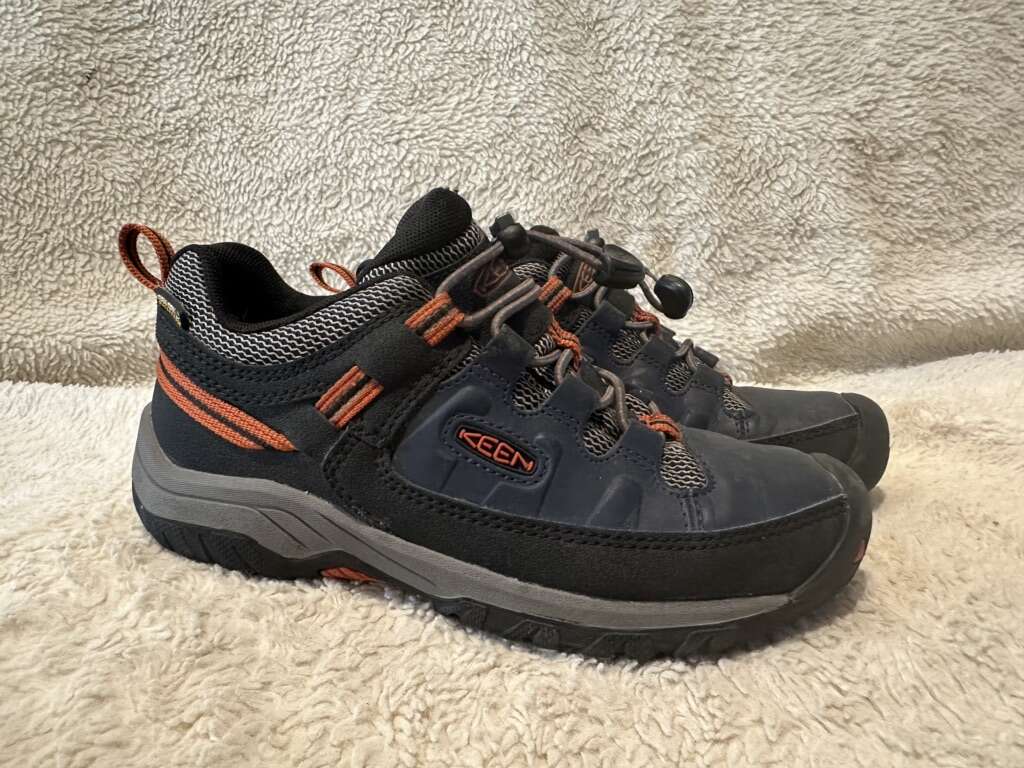 Keen youth size 2, navy blue with orange trim and elastic laces with the toggle at the top waterproof hiking shoes. These are in excellent condition, see photos for details. I take cash or Venmo, but cash is preferred. Text is best. 801-201-4446.check out my ads for additional sizes and styles.
