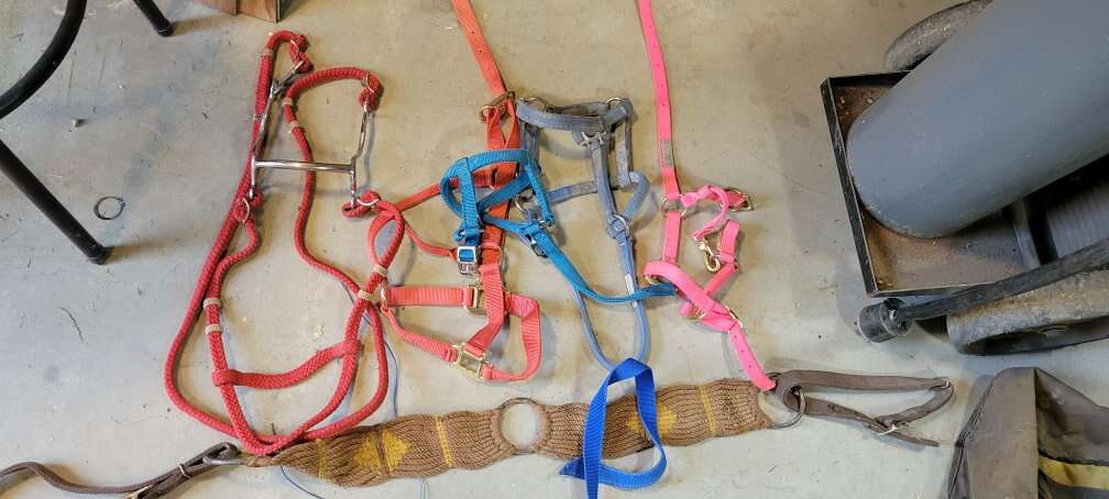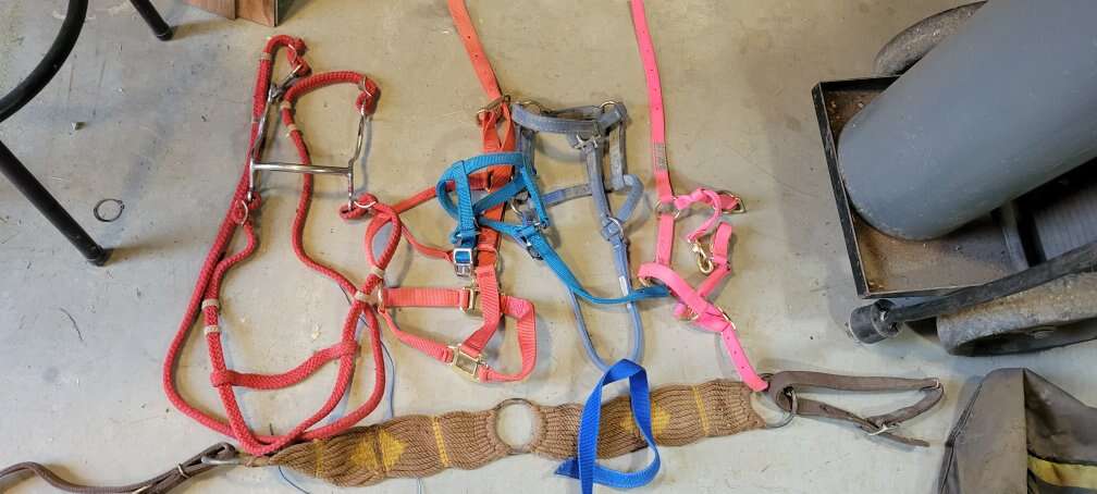 A few halters and a nylon headstall with a bit and a breast collar all the halters are colt or yearling call or text is best thanks for looking OBO
