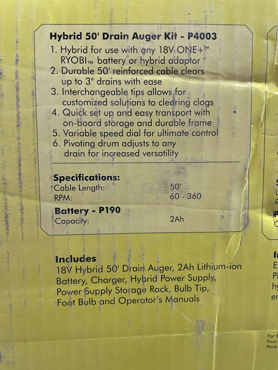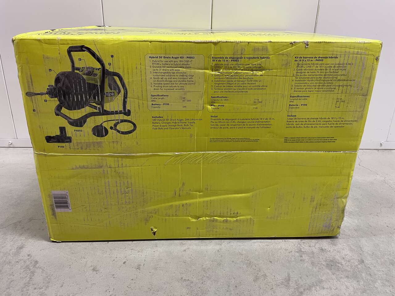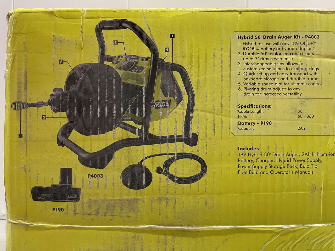 Up for grabs is a NEW Ryobi ONE+ 18V Hybrid Drain Auger Kit with 50 ft. Cable, 2 Ah Battery, 18V Charger, and Accessories.