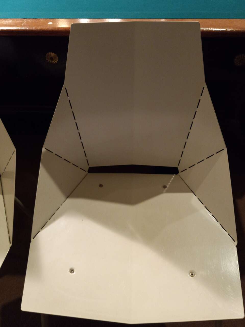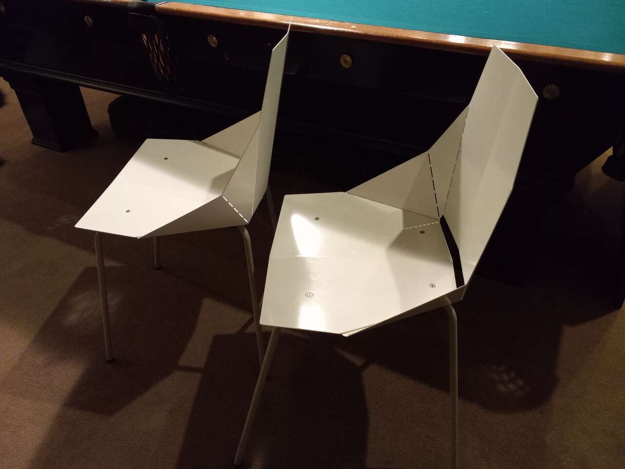 A pair of Blu Dot "Real Good Chairs" that look like folded origami paper but made of metal. Comfortable to sit on in excellent used condition. Originally cost $200.00 each.