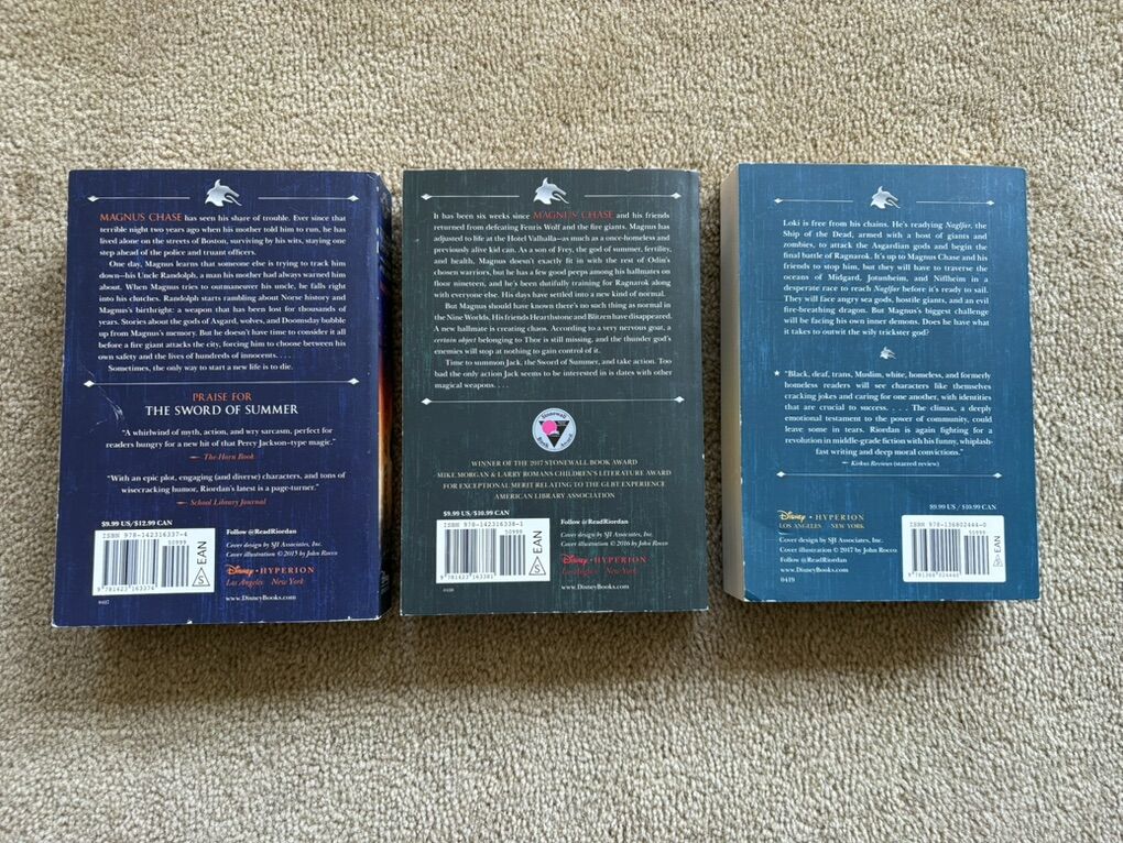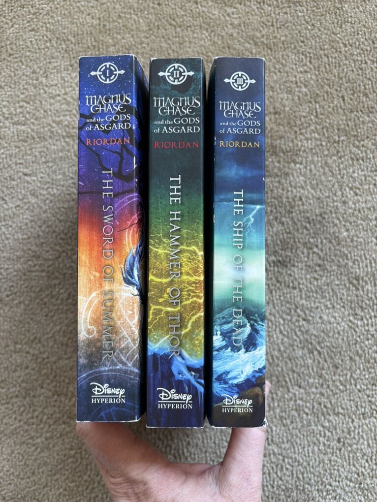 Magnus Chase and the Gods of Asgard Complete Series books 1-3, by Rick Riordan: The Sword of Summer, The Hammer of Thor, and The Ship of the Dead (Disney Hyperion 2015, 2016, 2017). Paperbacks in excellent condition. Spines unbroken, no marks. Each includes bonus material. Text only. Cash or Venmo.