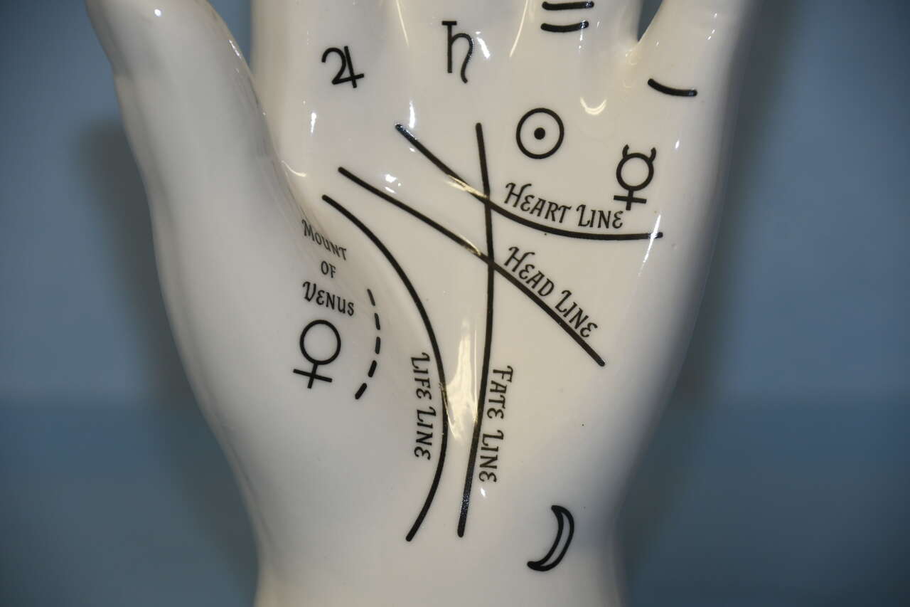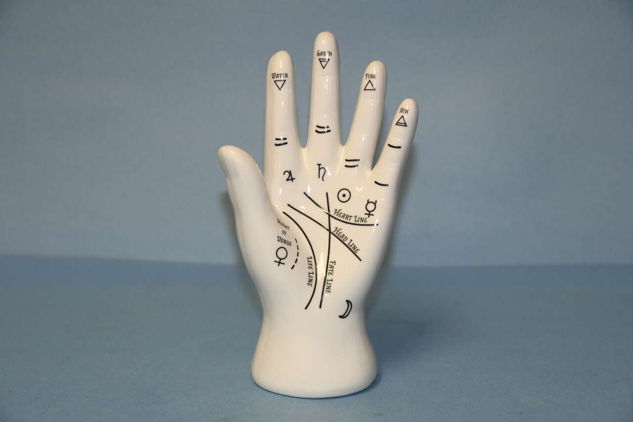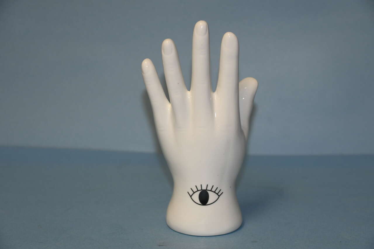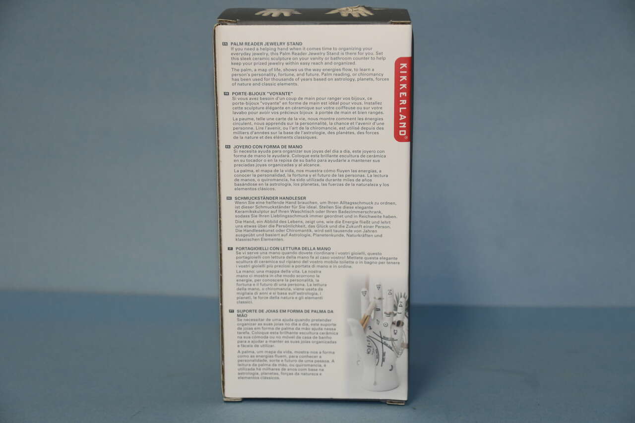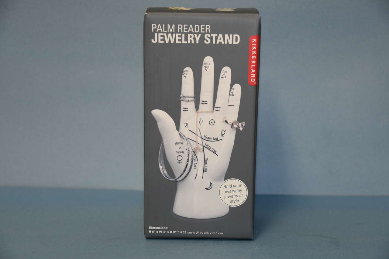 This PALM READER JEWELRY STAND is about 8" x 4" x 3". It is NEW & has NEVER BEEN USED. The top of the box has some tears (It came that way when I purchased it). Our home is smoke free. Questions??? Please ask. We are located in Plain City. Cash only please.