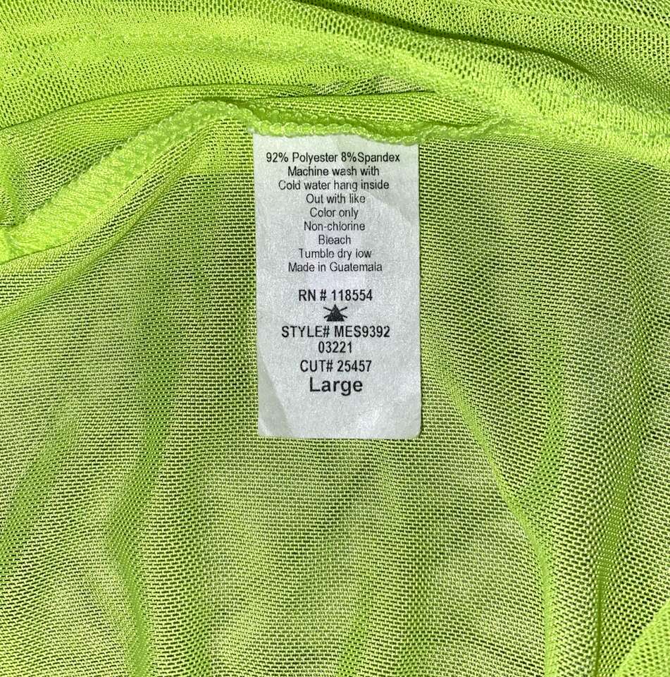VenmoNew with tags. Neon yellow Mesh Baby Girl T-shirt in Size Large. It's very soft and stretchy and would look cute with a black bra or a tank underneath. 92% polyester, 8% spandex. I found a full size pic of the front and back online, but the one with tags attached to the sleeve is the one being sold.