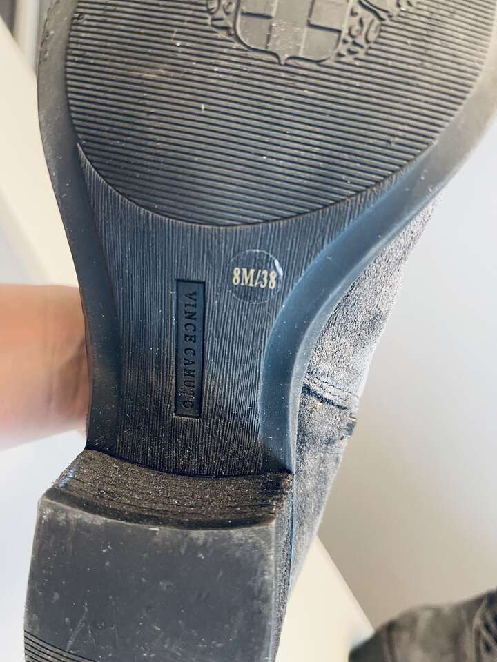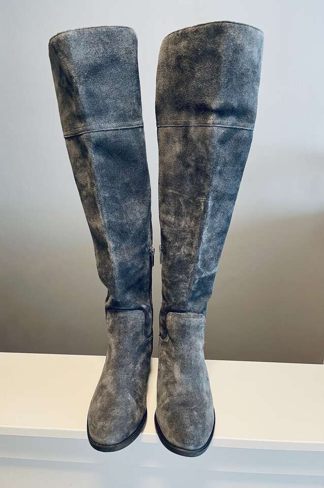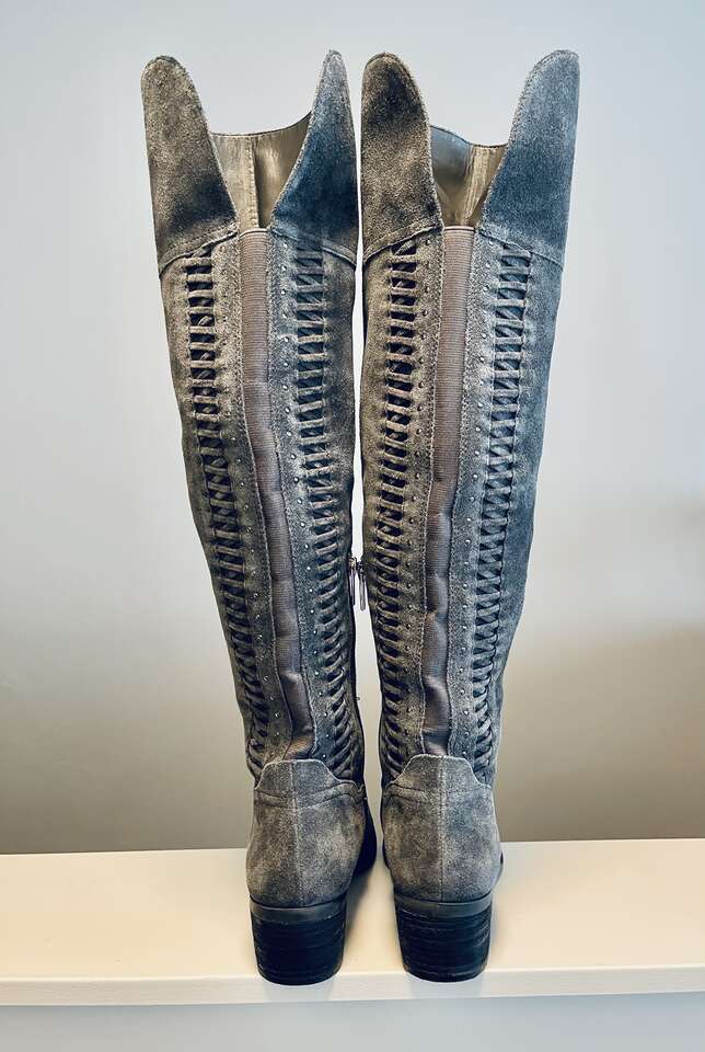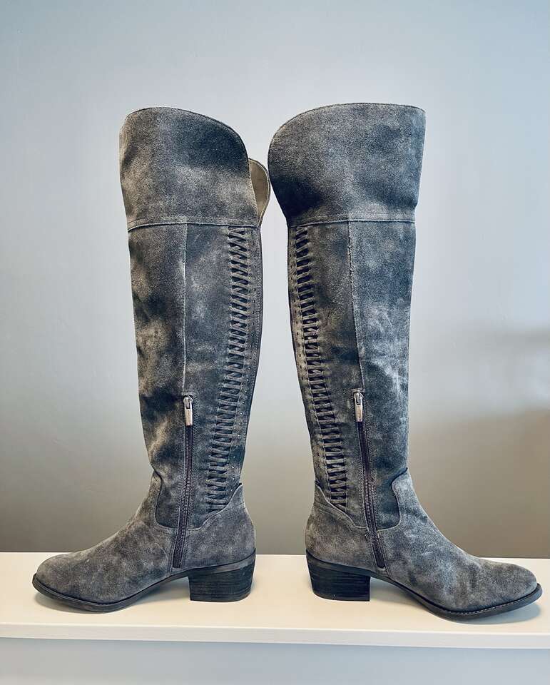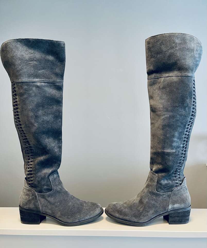 Beautiful Vince Camuto Tall Over the Knee Brilley Boots. Genuine soft gray suede leather. Pull on boots with inner side zippers, split shaft and flex back panel. Crisscross stitch and silver stud detailing on the back of boots. 21" tall w/ comfortable 2" heel. Timeless almond toe. Non-slip outer sole with signature Vince Camuto logo.