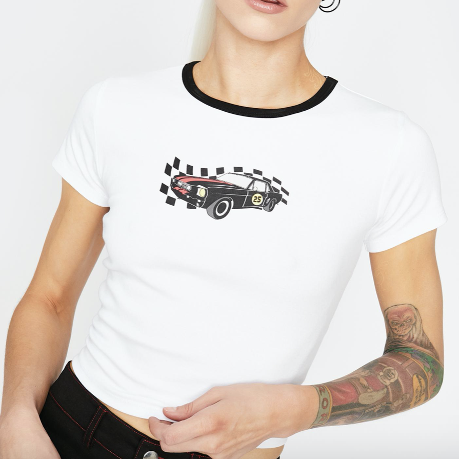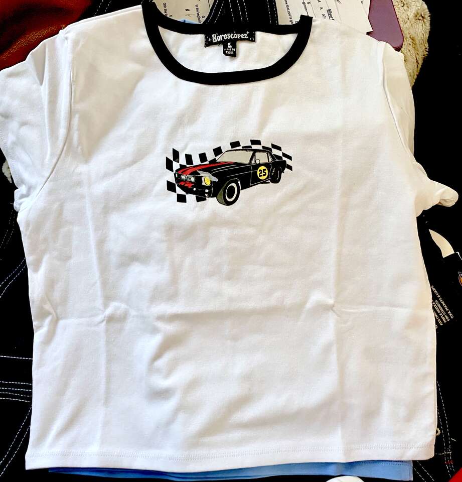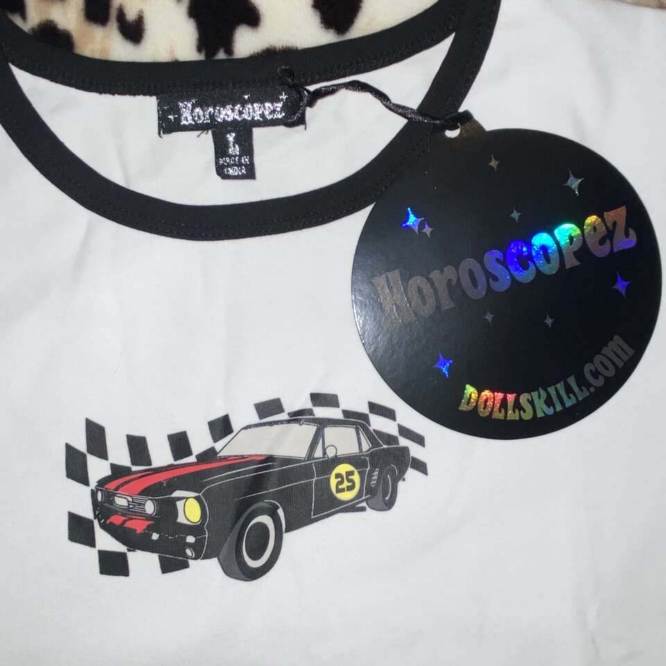 HOROSCOPEZ Not Your Lift Baby Tee cuz your makin' moves and they can't keep up! Your ride isn't for sharing in this short sleeve baby tee that has a slightly cropped fit, a contrast colored neckline N' a racing car graphic on the front. Cotton blend.