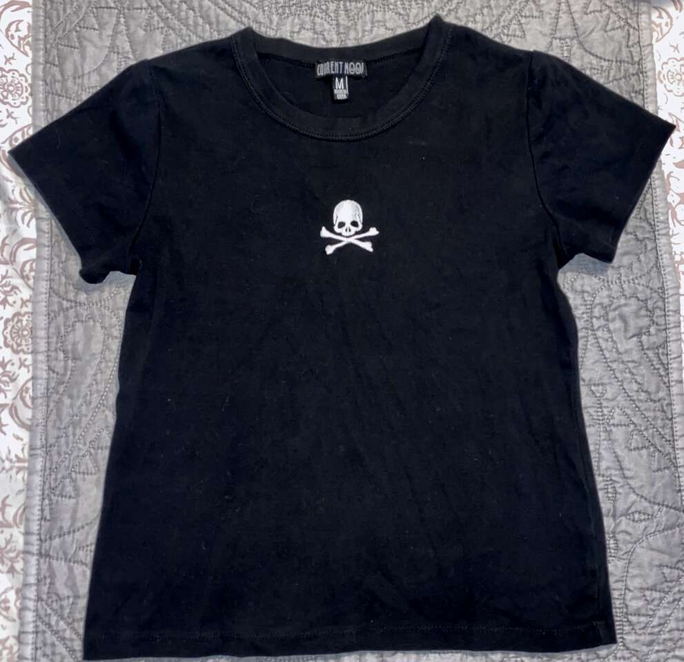 send the haters to the grave, babe. This crop tee has a stretch cotton jersey construction, deadly skull embroidery on the front, and short cap sleeves. 95% cotton, 5% spandex.