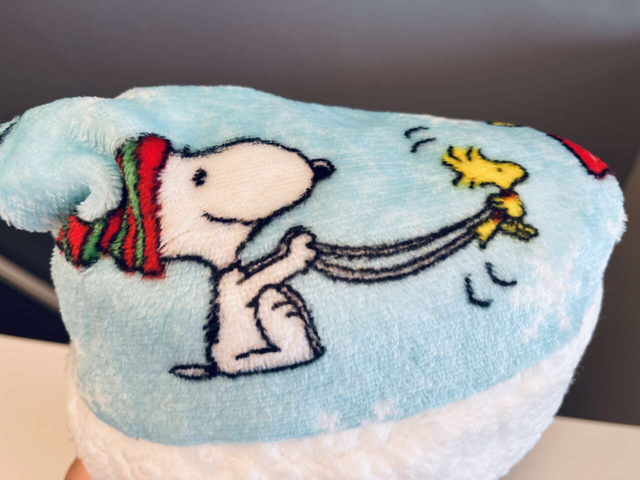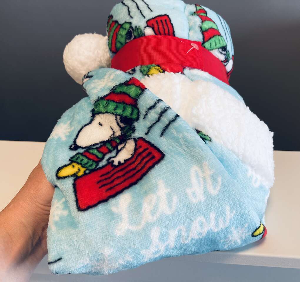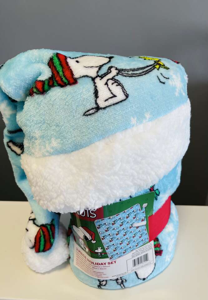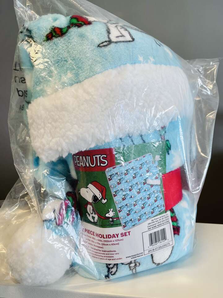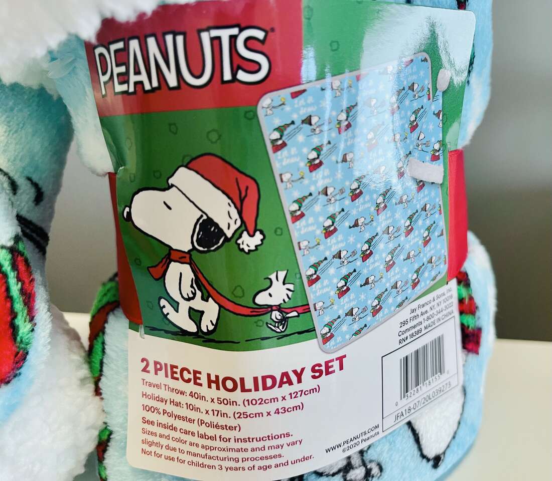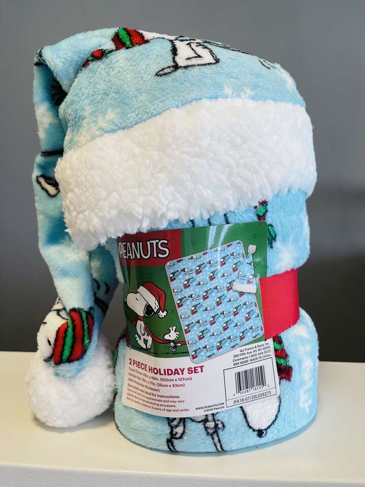Super cute Peanuts Kids 2/pc Holiday Gift Travel Set. Includes 1 travel throw blanket, 40" x 50" size. 1 Holiday hat. Soft and plush with adorable Snoopy and Woodstock winter Holiday print.