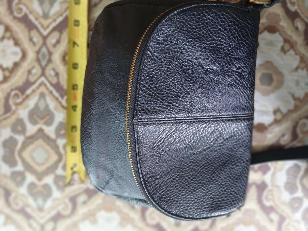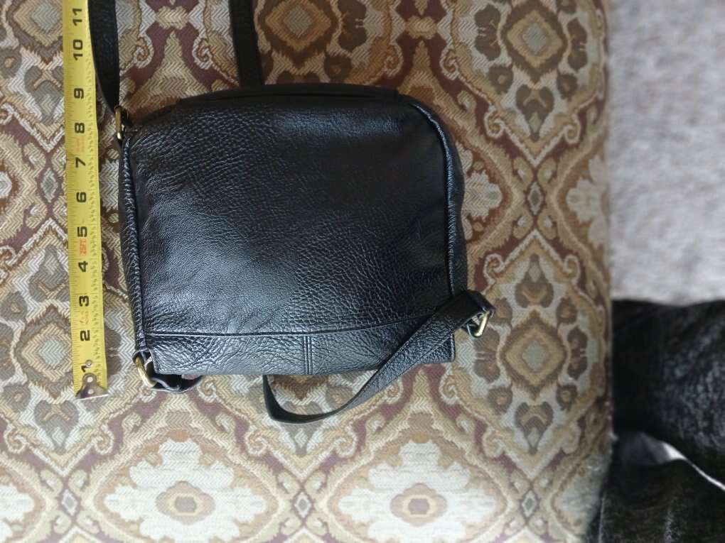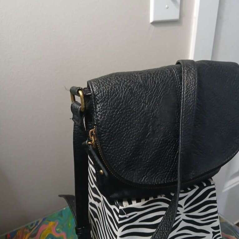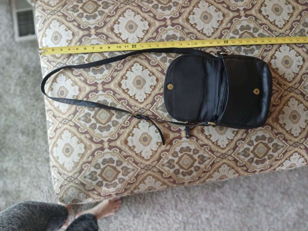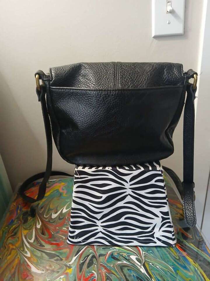 Adjustable crossbody strap, zip closure. Black liner, slip pocket on the back.