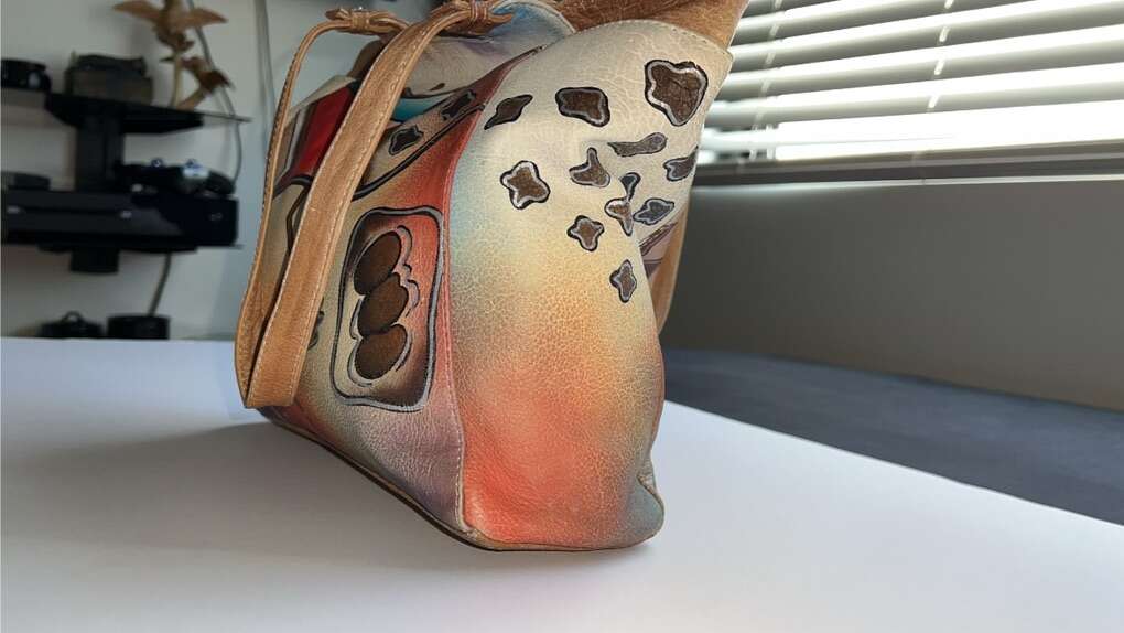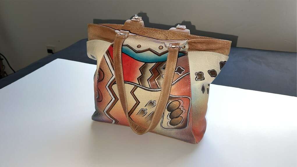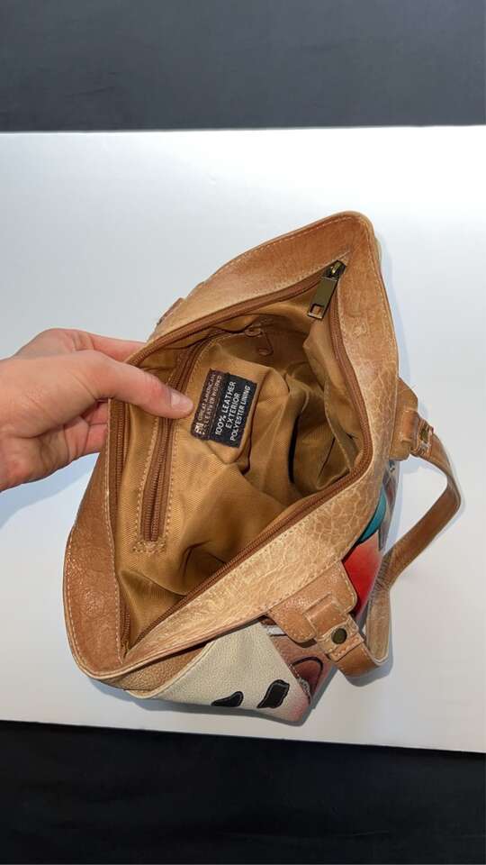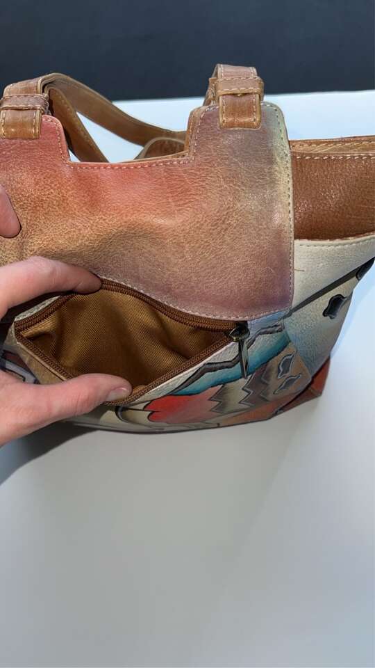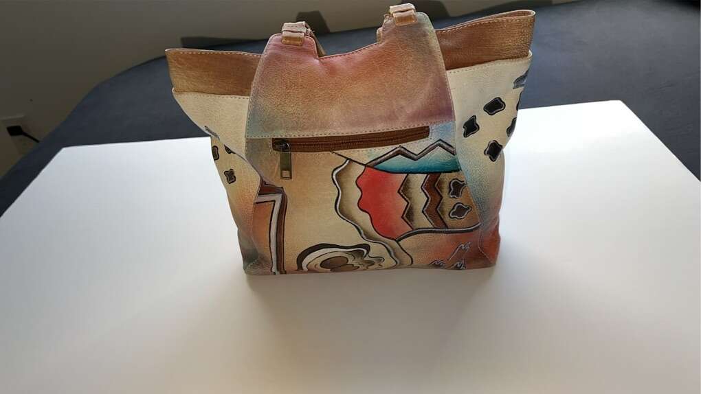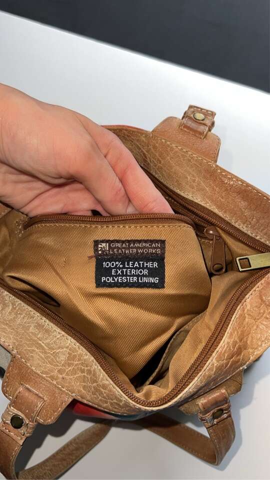 •Great American Leather Work shoulder bag/purse. •100% genuine leather exterior, polyester lining inside with a main zipper to open/close the interior of the bag. •southwestern/native artwork design •A good medium/small sized bag with 3 interior pockets (one with a zipper). •3 outside pockets (also one with a zipper) and the other two on the sides