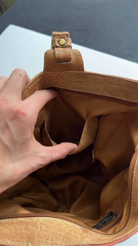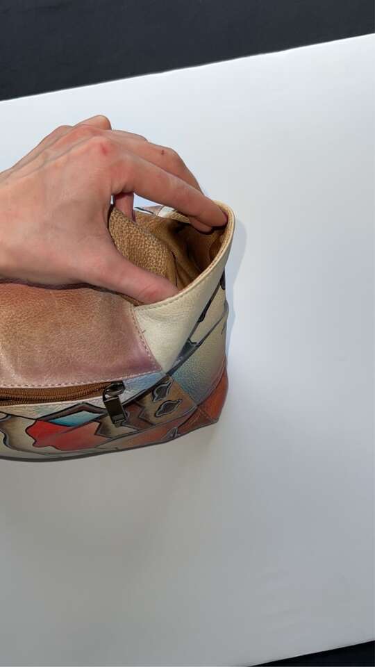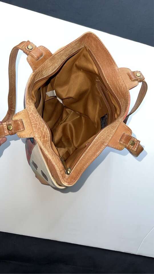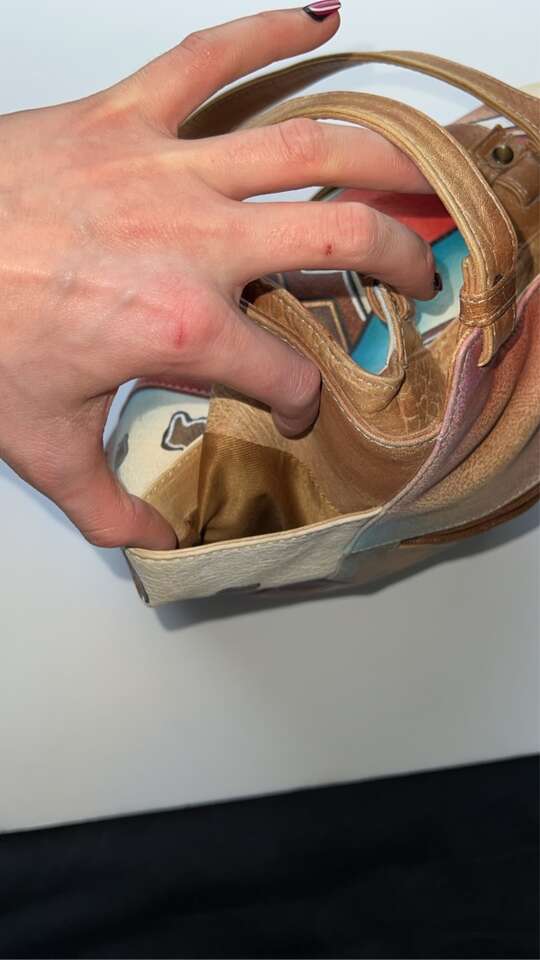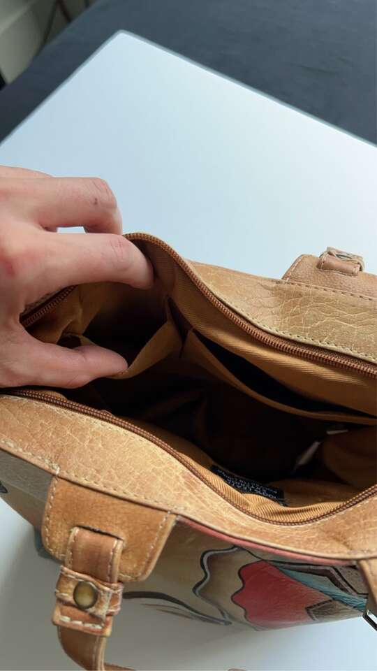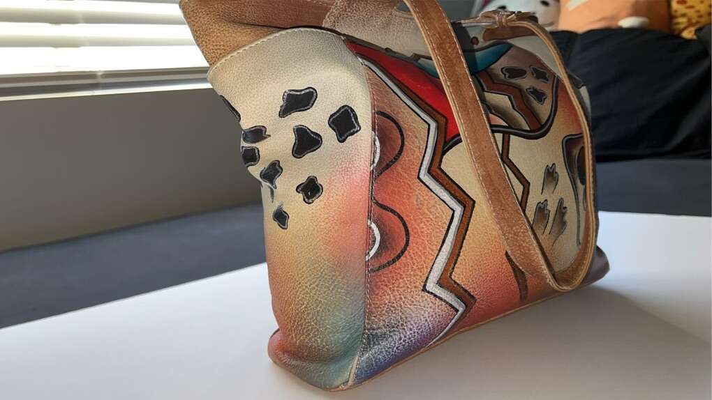 •Great American Leather Work shoulder bag/purse. •100% genuine leather exterior, polyester lining inside with a main zipper to open/close the interior of the bag. •southwestern/native artwork design •A good medium/small sized bag with 3 interior pockets (one with a zipper). •3 outside pockets (also one with a zipper) and the other two on the sides