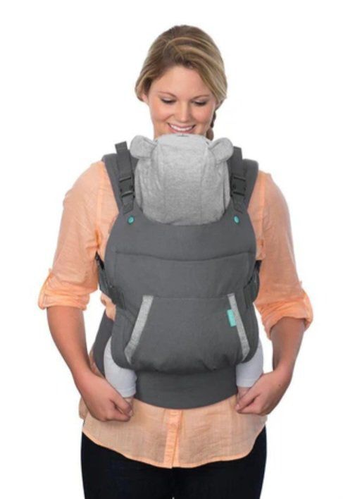 Turquoise & grey kid carrier. Holds kids 12-40 pounds. Can be worn different ways. In the front, back, child facing toward or away from you. The bear hood can be clipped on or off, so the child doesn't get sun in their eyes.