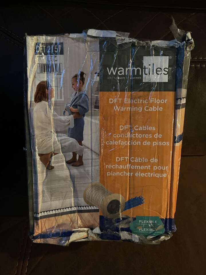 New Emerson Warmtiles DFT2157 electric floor warm cable kit 240V 8.5AMPS. This kit will cover 145-165 square feet depending on spacing. For use under tile, stone, laminate or engineered flooring. Would work well for a bathroom.