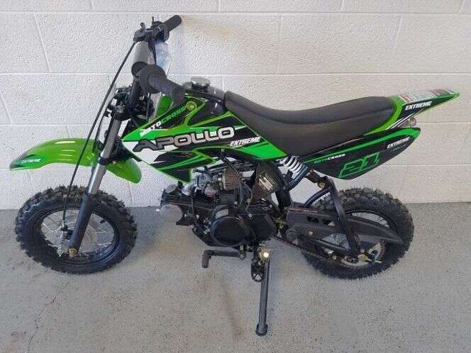 CashAppThis bike is for Sale for $799 OUT OF DOOR PRICE! For sale is this brand new Apollo RFZ -70cc dirt bike. This bike fits riders up to 100 lbs. Great for youth riders. The seat height is 25 inches. The front and rear wheels are both 10 inches. This bike has a 4-stroke engine with a kick start and a 4-speed transmission with all-down gears. The bike also comes with training wheels. Visit Apolloatv.com for all specs. Phone number-385-977-8294 DL# 8357