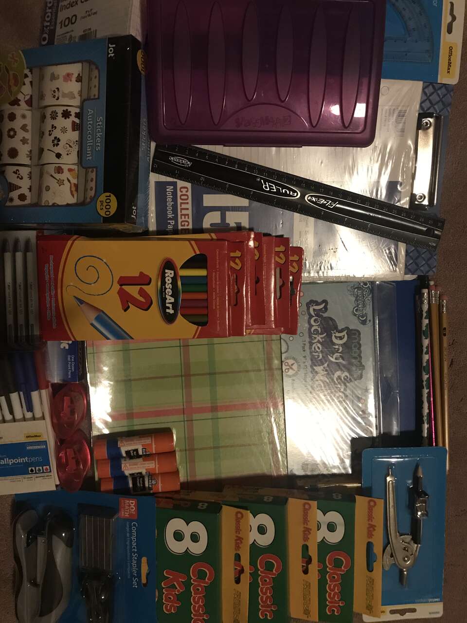Lots of RoseArt Colored pencils pens notebook paper glue stick stickers markers compass pencil case