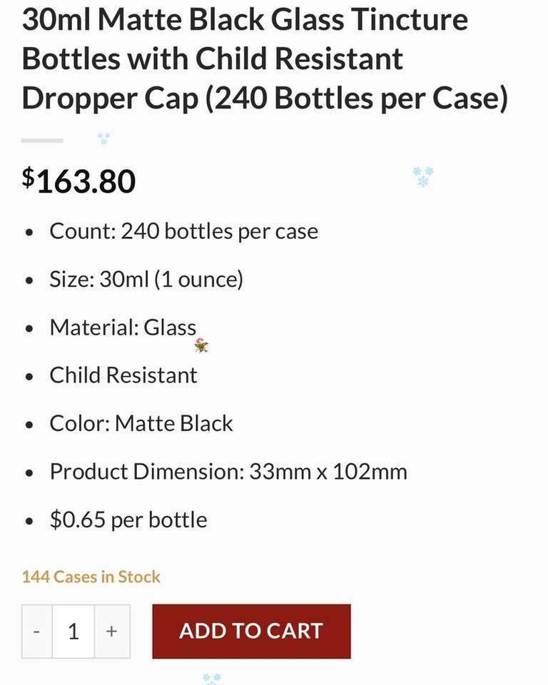 Compare online at .65 per bottle(lowest price found) for a case, or $1-2 per tincture bottle at local stores.