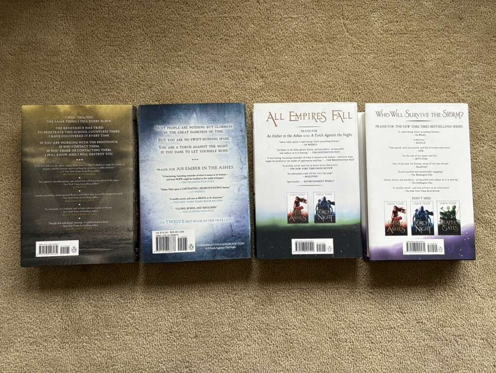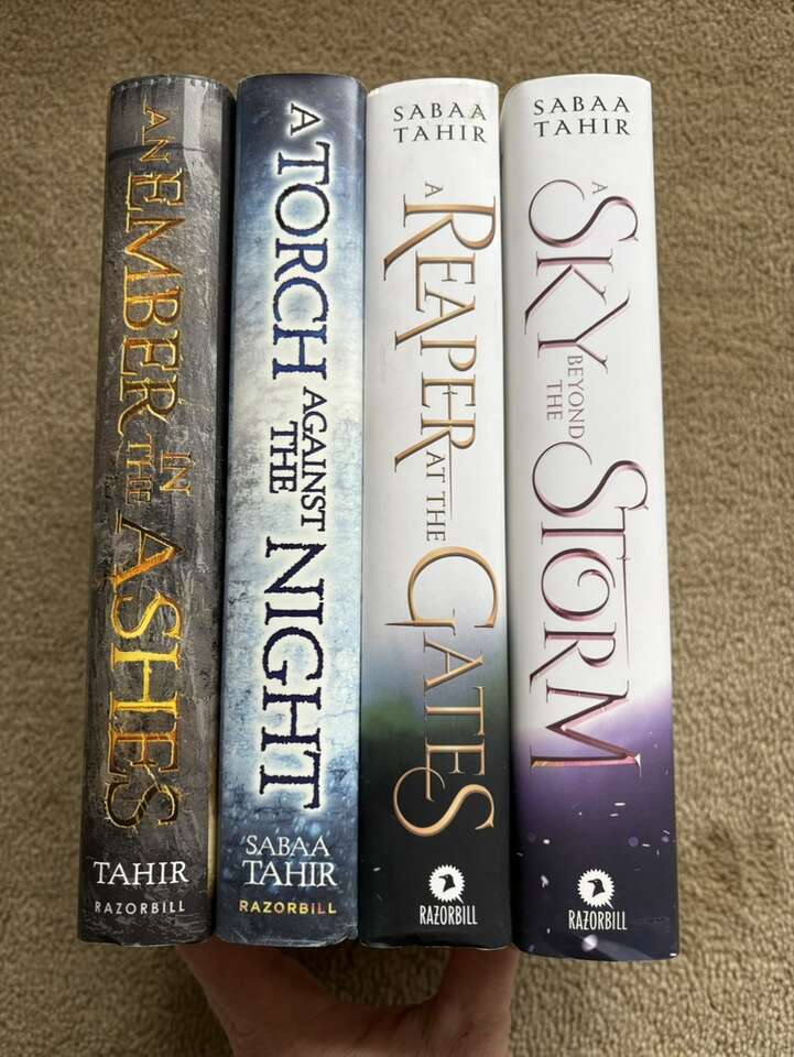 An Ember in the Ashes books 1-4, by Sabaa Tahir: An Ember in the Ashes (2015, 446 pages), A Torch against the Night (2016, 452 pages), A Reaper at the Gates (2018, 458 pages), and A Sky Beyond the Storm (2020, 516 pages). Hardcovers in excellent condition, including dust jackets. Text only. Cash or Venmo.